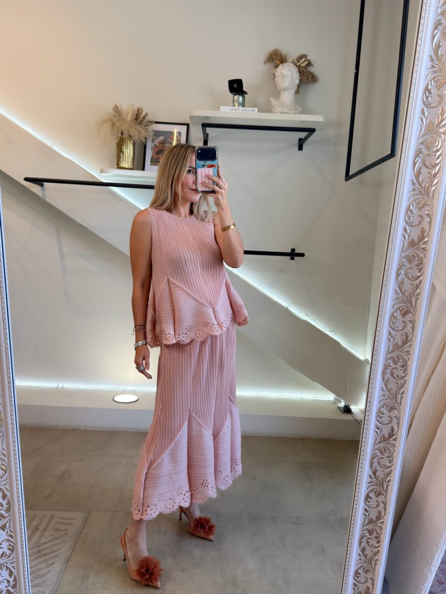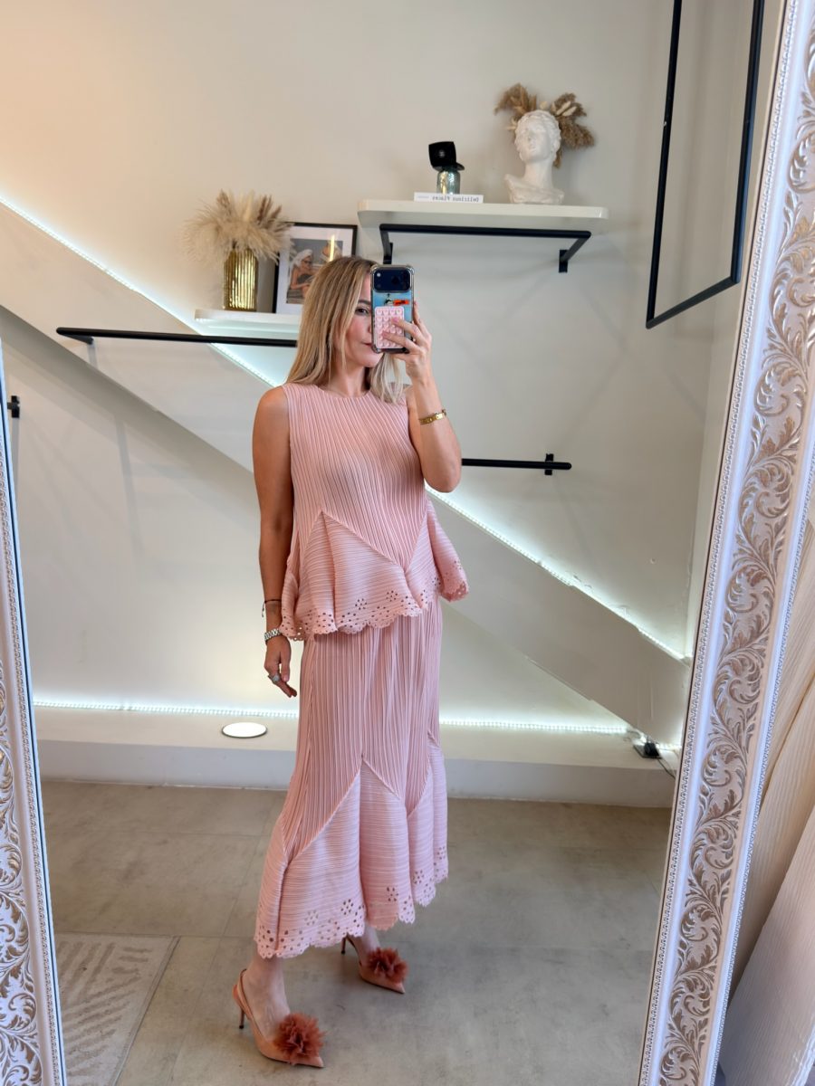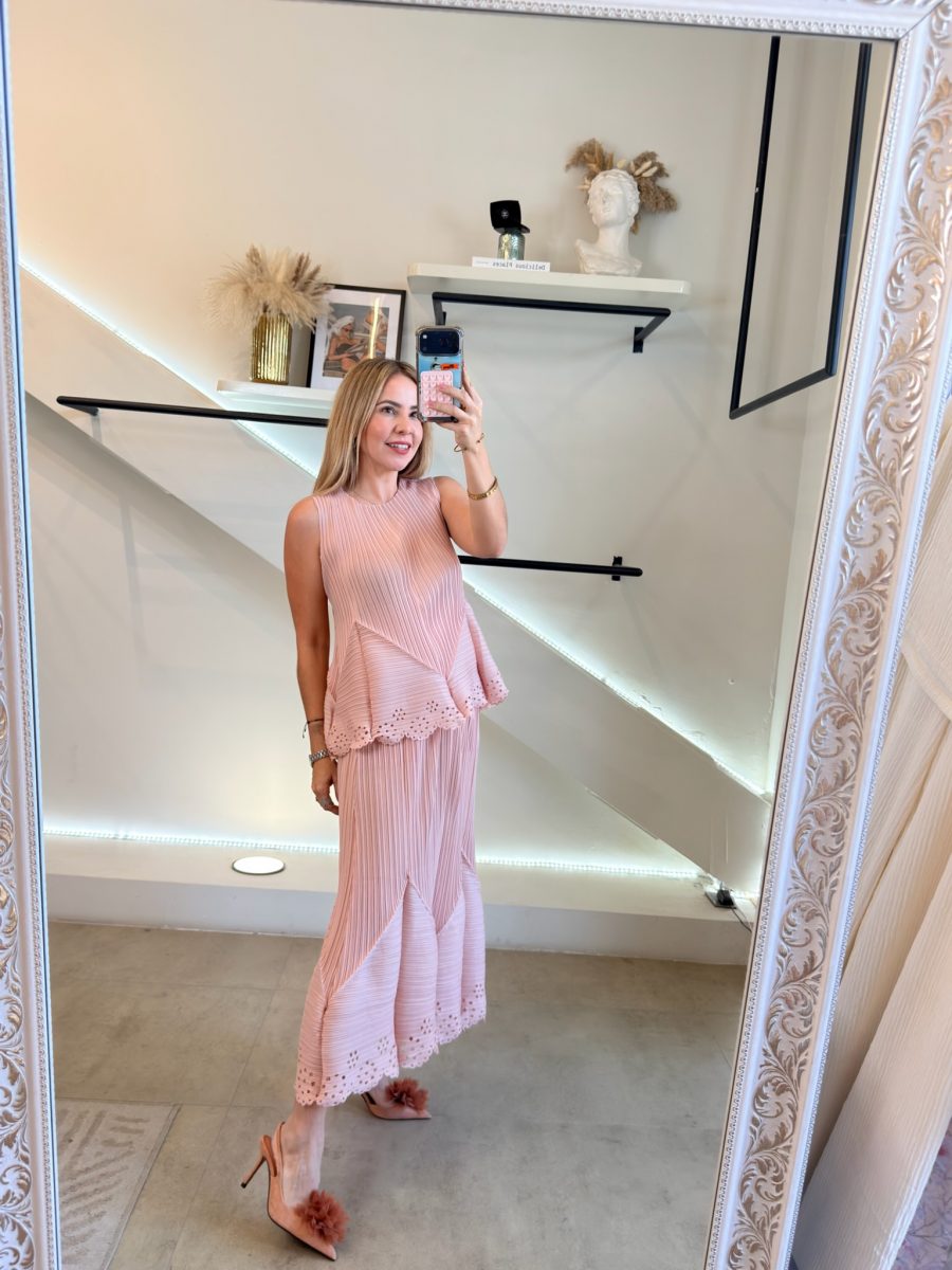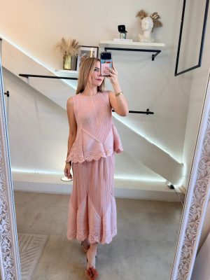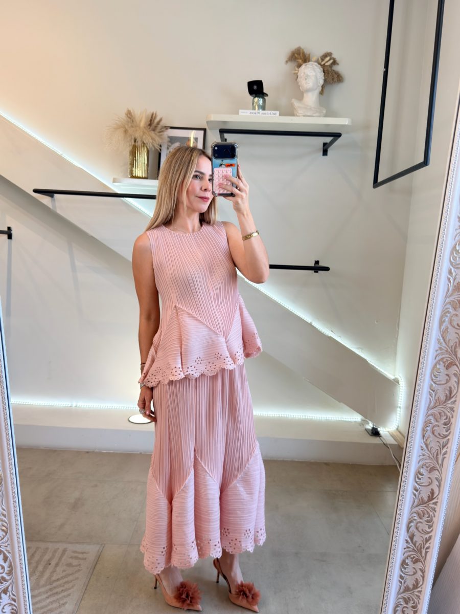 Conjunto falda midi con diseño plisado y diseño primavera Pink en blusa y falda