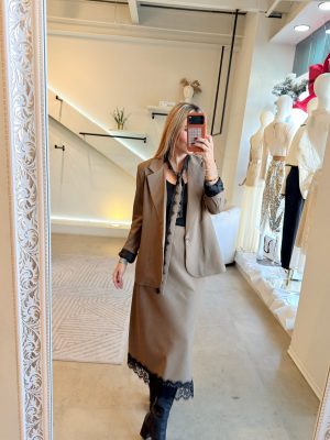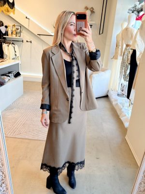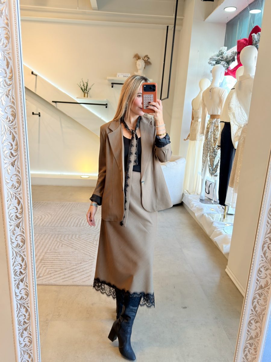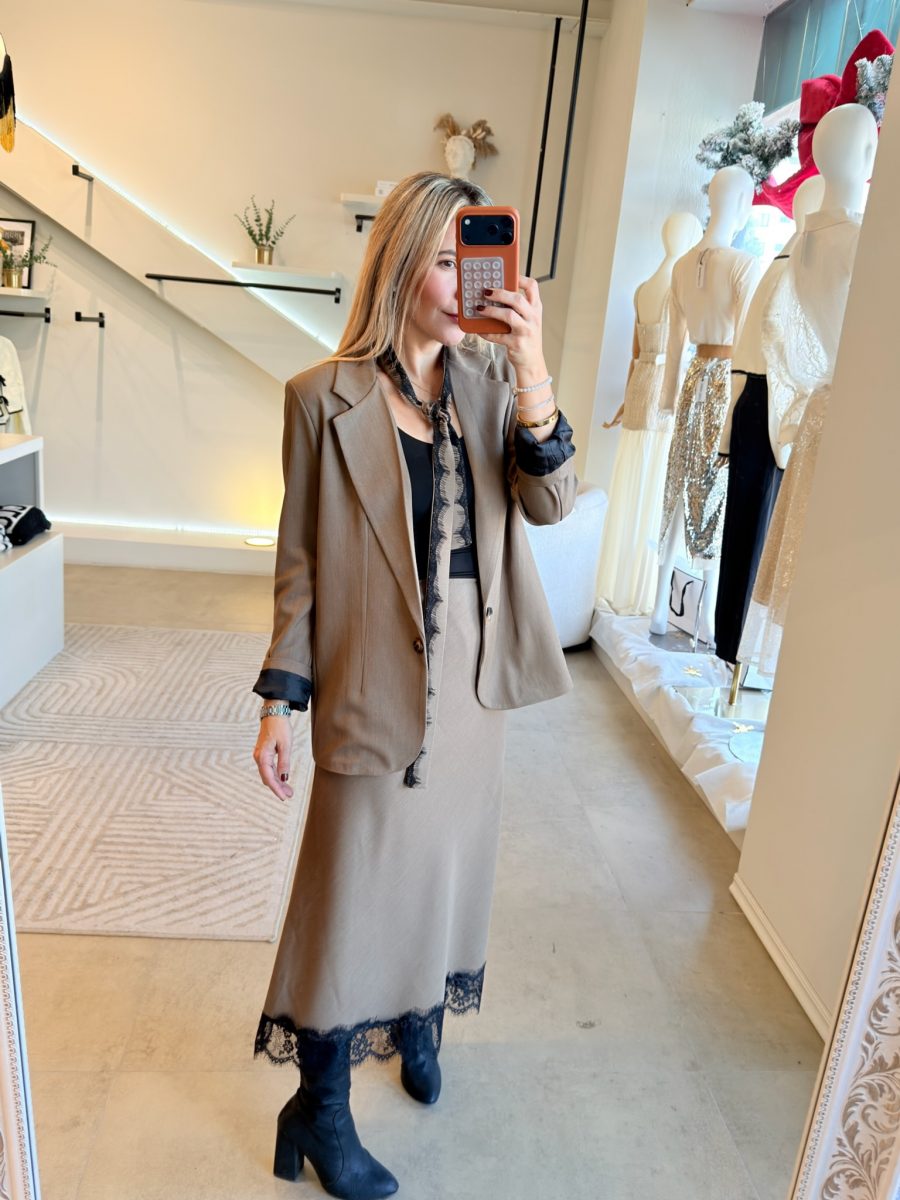 Conjunto Blazer y falda midi color arena tela formal con encaje elástico en cintura