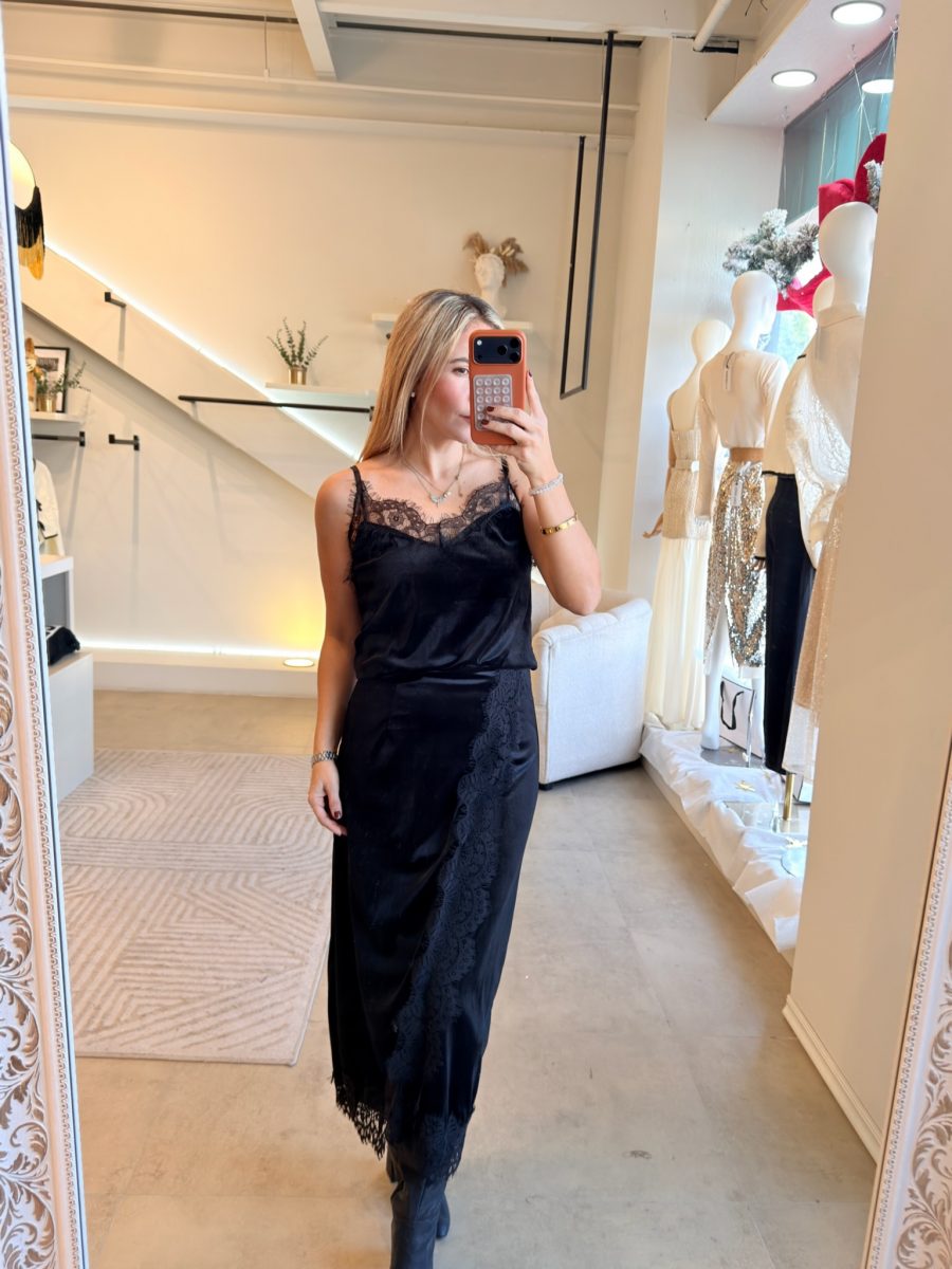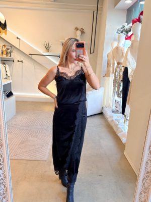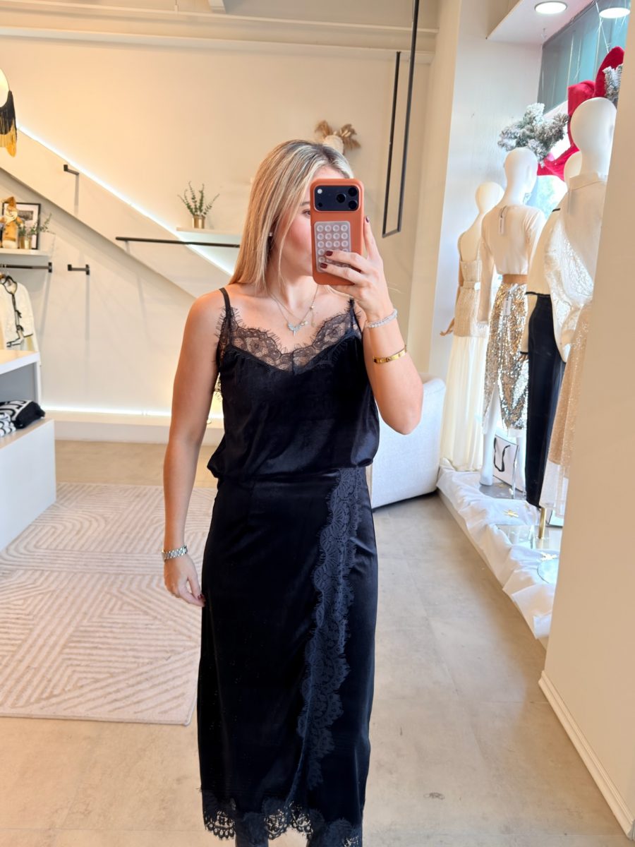 Conjunto terciopelo negro con detalles de encaje negro en blusa y falda.