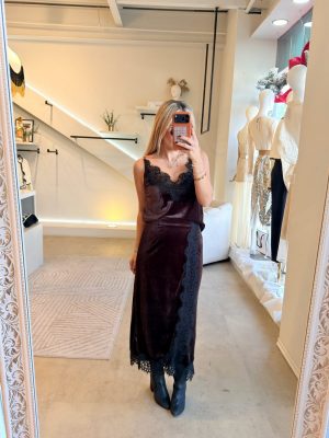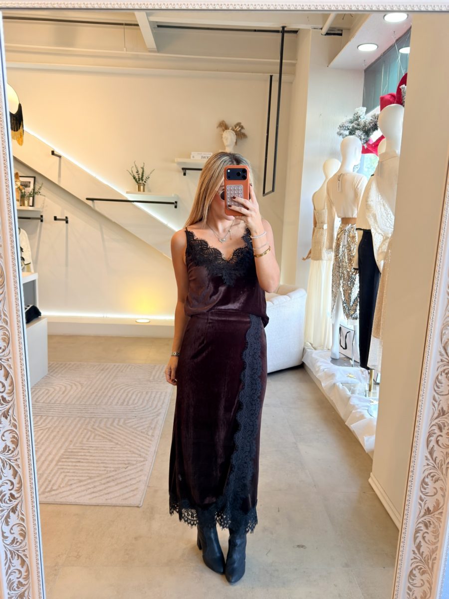 Conjunto terciopelo cafe cobrizo con detalles de encaje negro en blusa y falda.