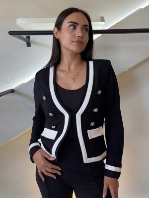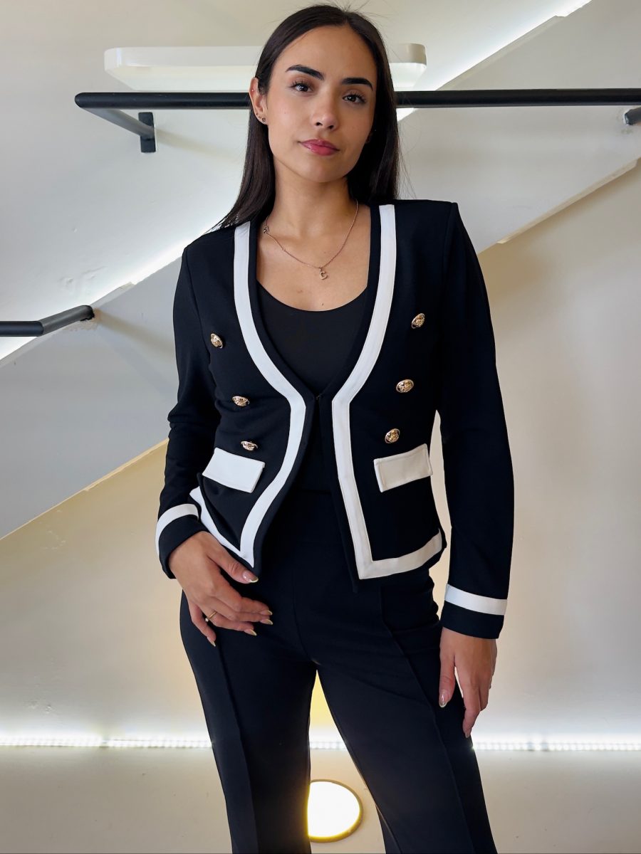 Conjunto blusa tipo blazer corto y pantalón tela stretch color negro botones dorados