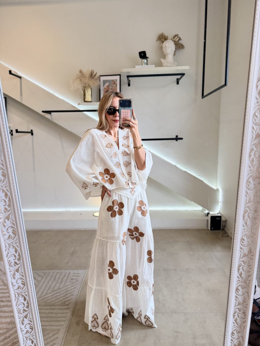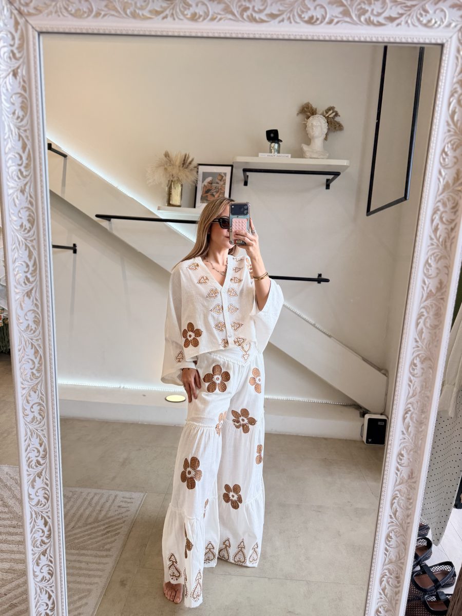 Conjunto Ivory de pantalón y blusa con diseño de flores