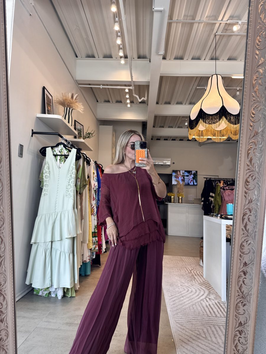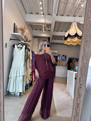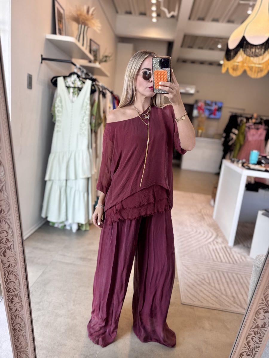 Conjunto blusa manga corta y pantalón holgados tela seda italiana color vino elástico en cintura
