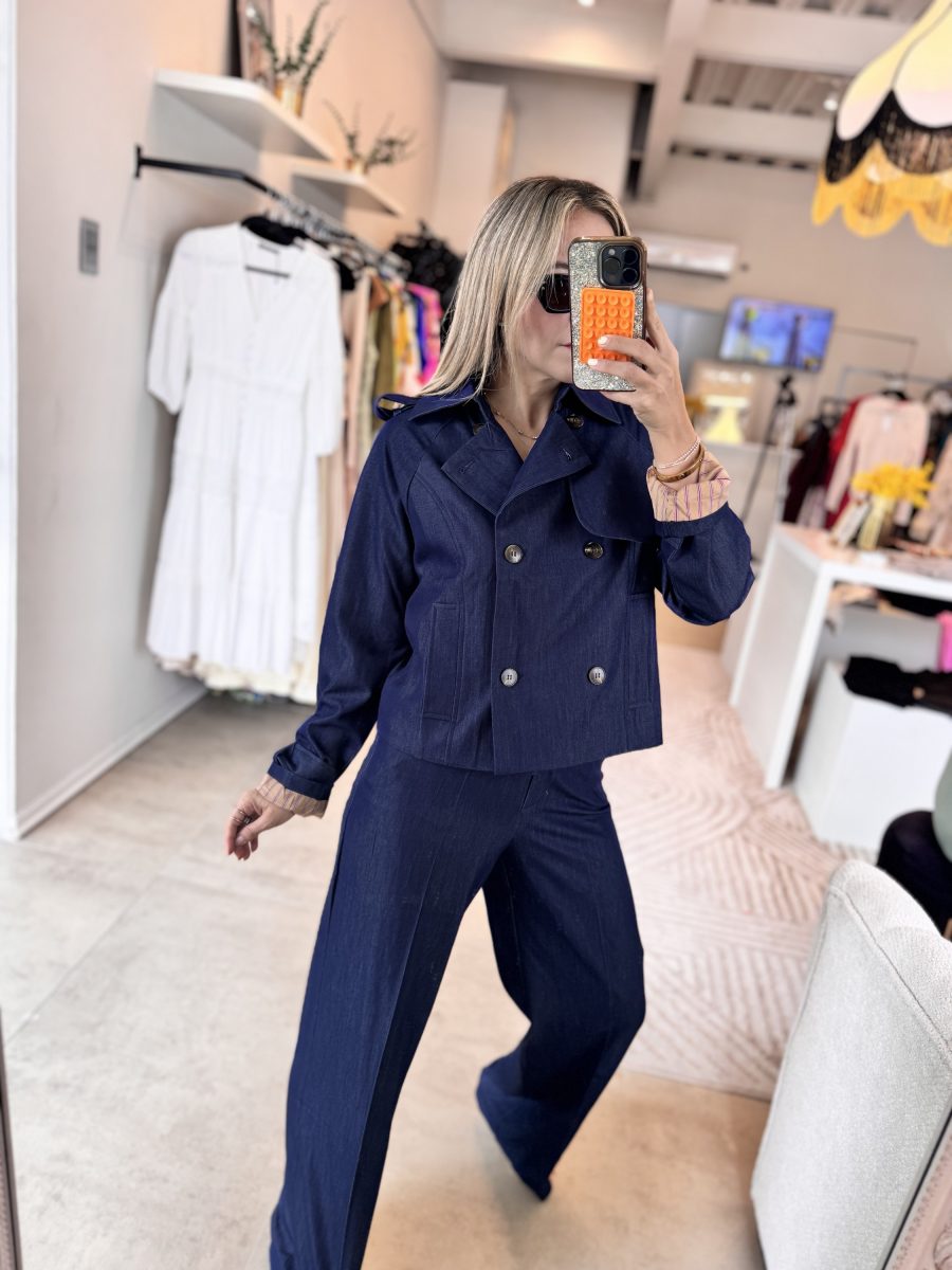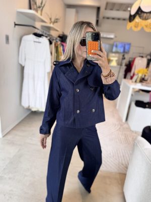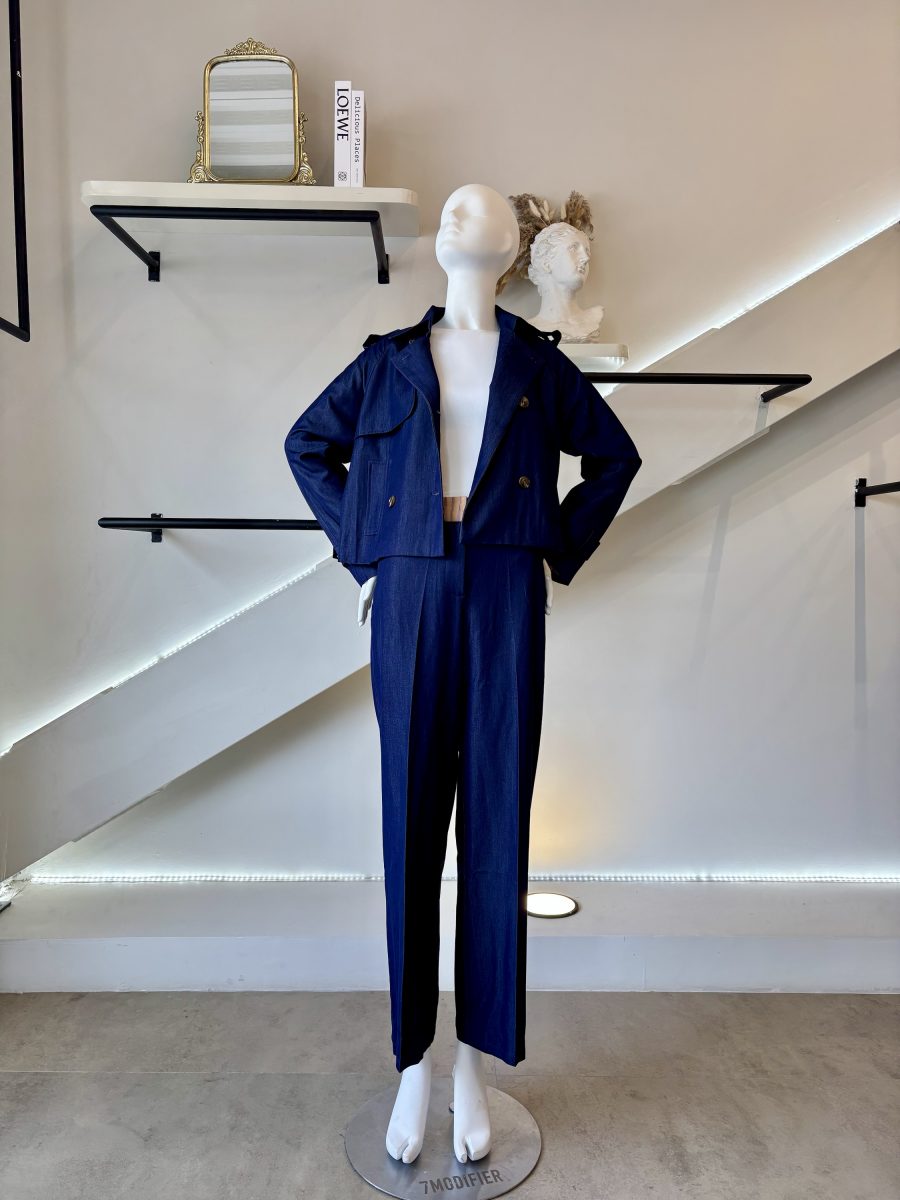 Conjunto pantalón y jacket con botones color azul tela algodón stretch