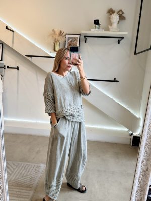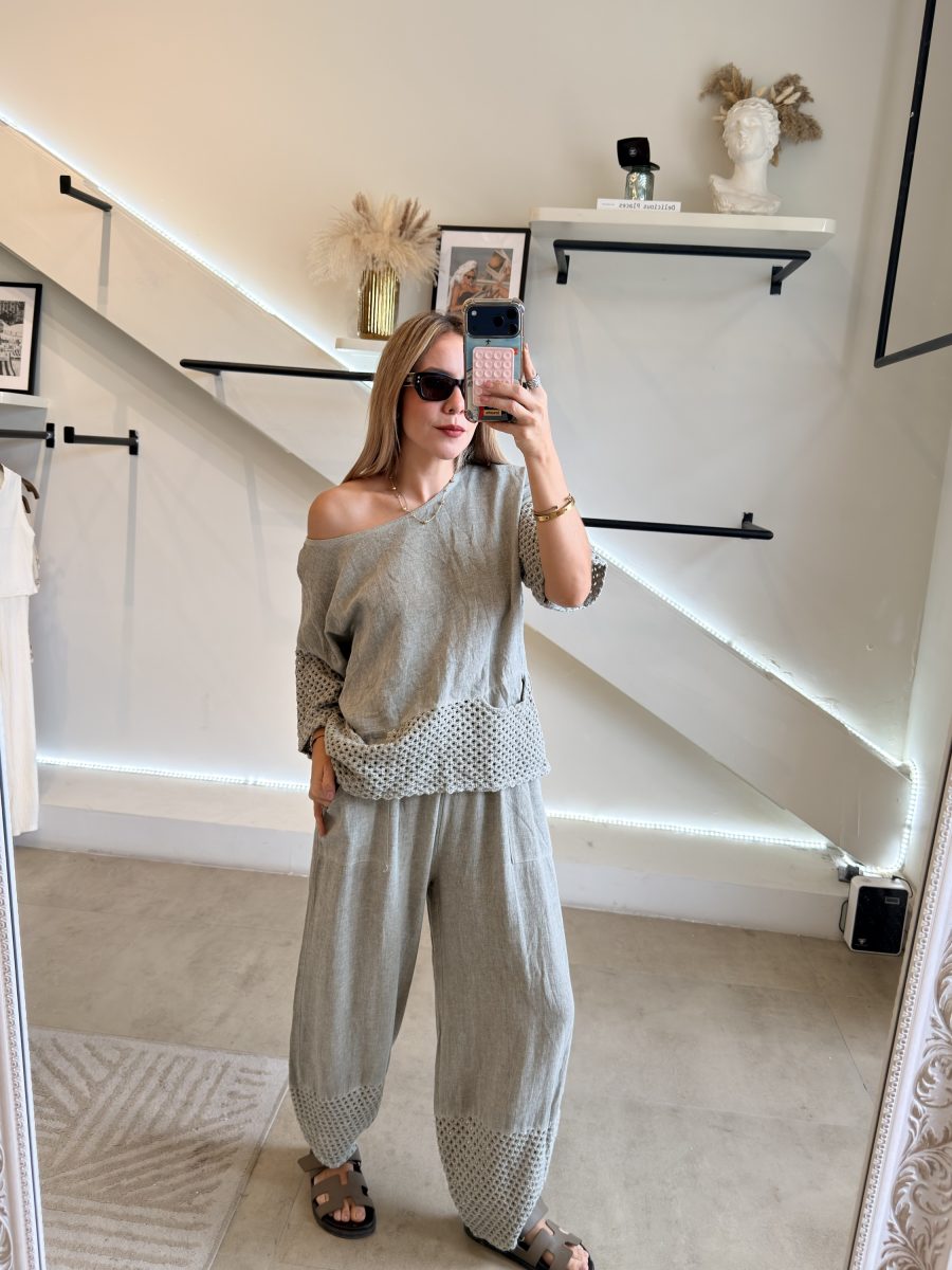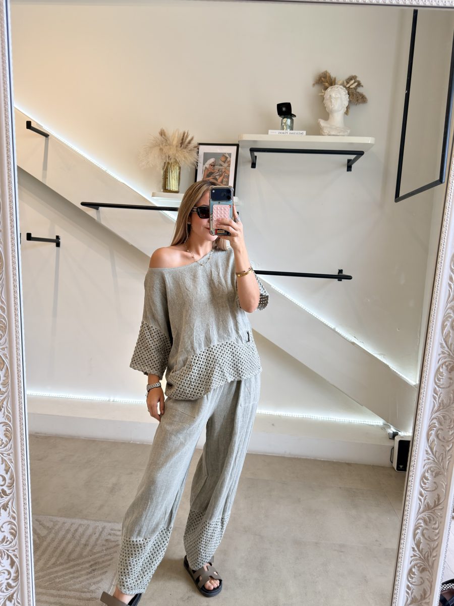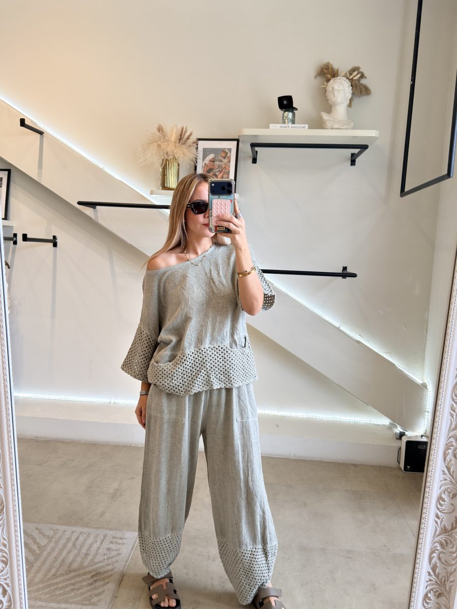 Conjunto blusa y pantalón tela de lino combinada con algodón y aplicación bordada color verde olivo