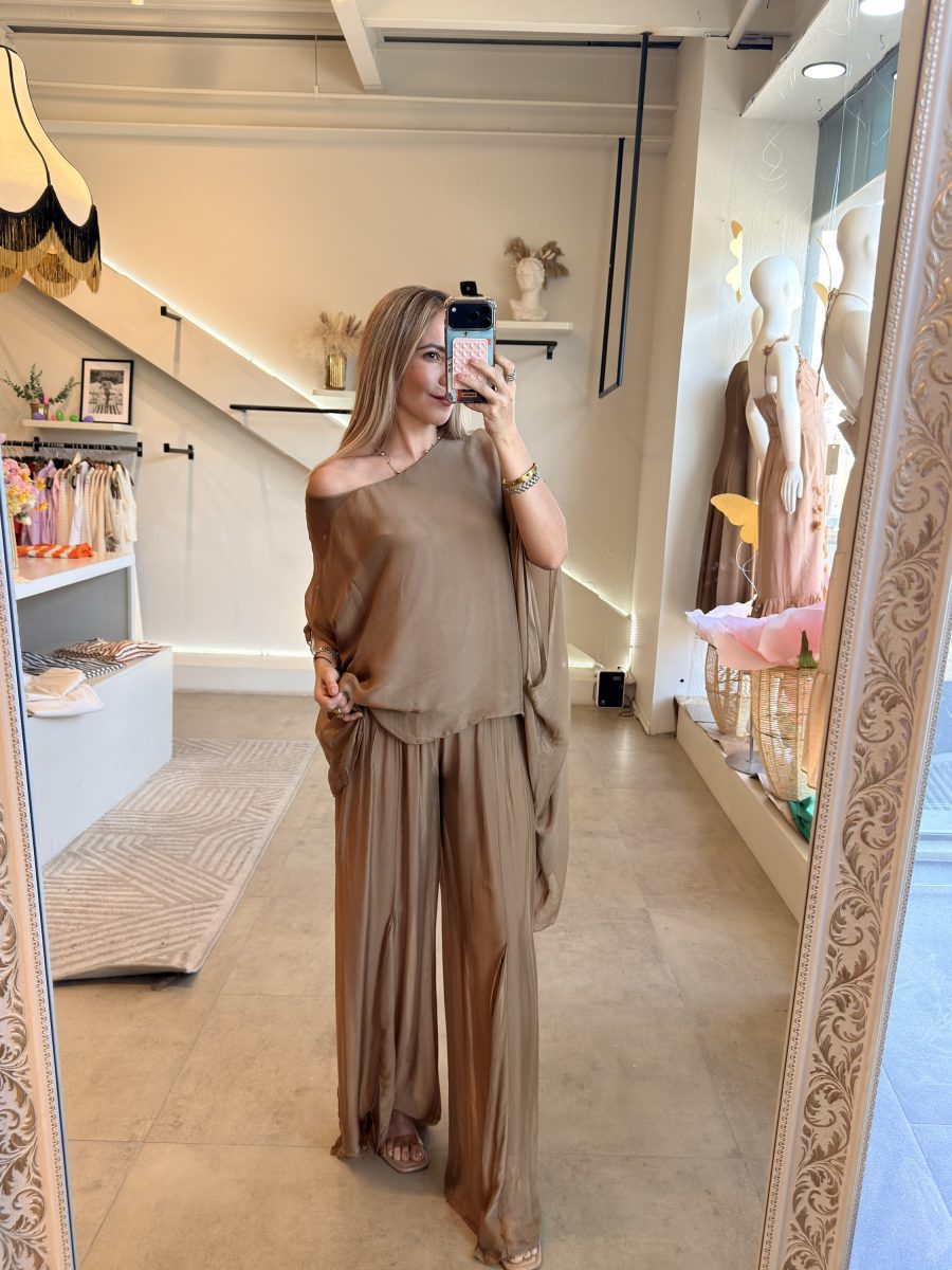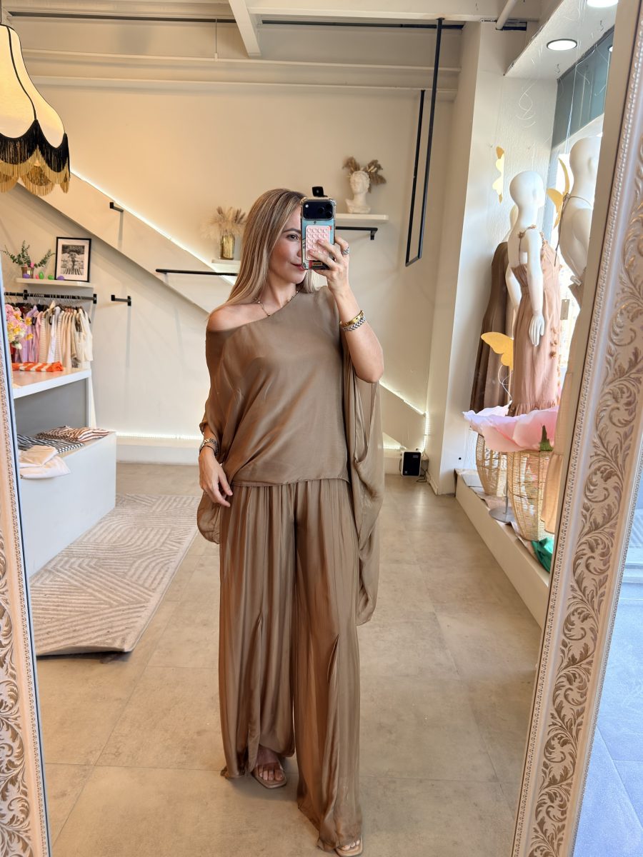 Conjunto golden de pantalón y blusa efecto capa asimétrica.