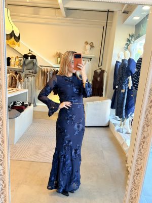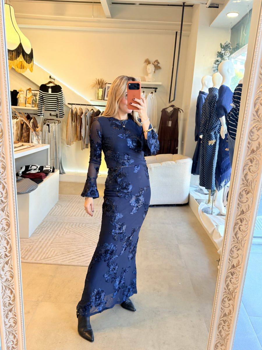 Conjunto blusa y falda midi color azul con bordado de flores