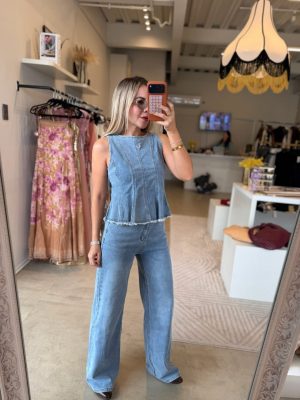 Conjunto Blusa con cierre en la parte de atrás corte A y pantalón tela de mezclilla color azul claro