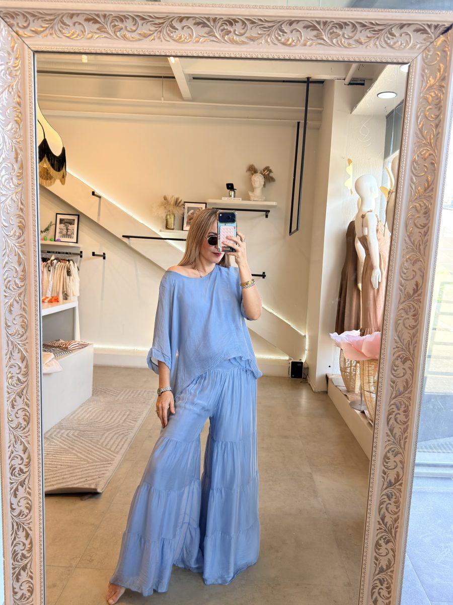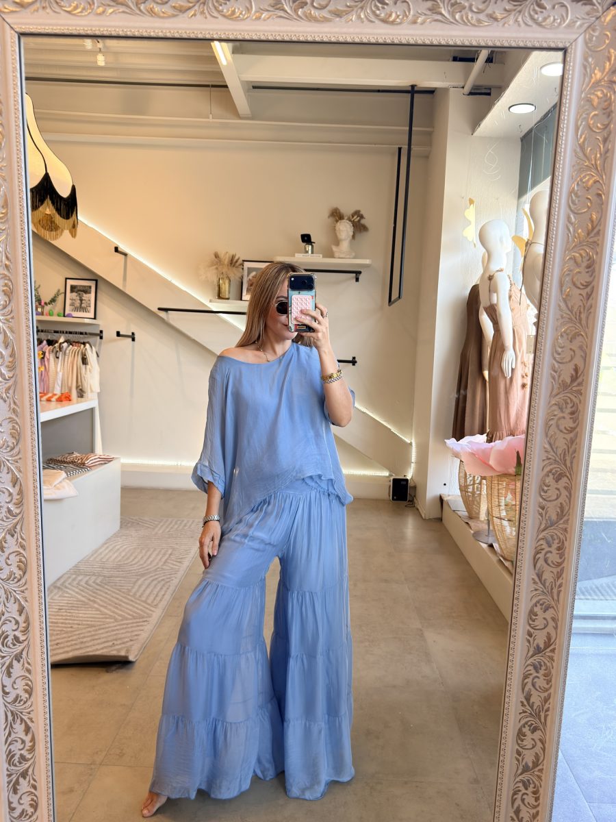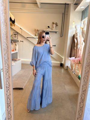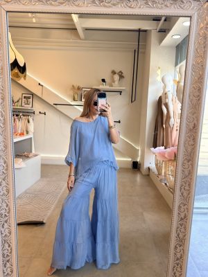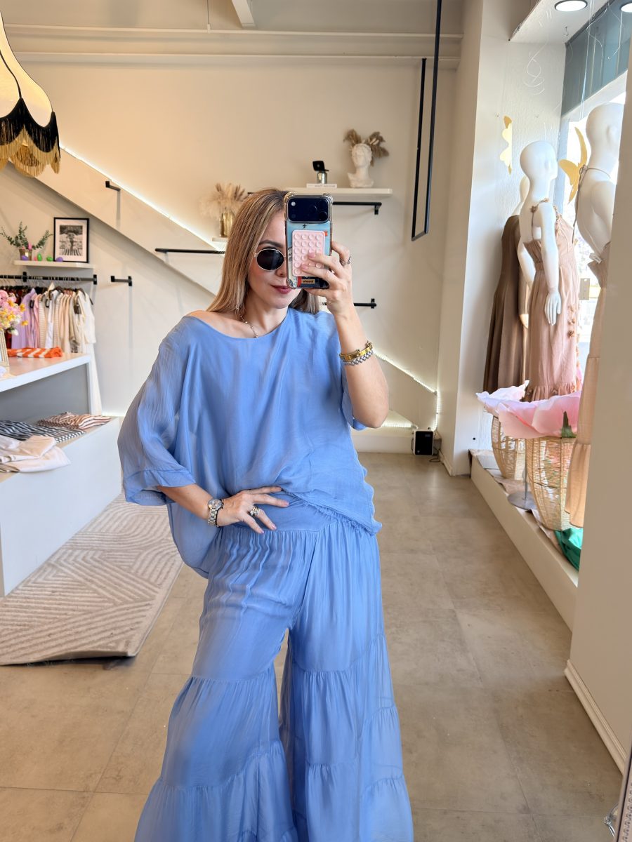 Conjunto de blusa y pantalón fresco tipo seda azul pastel