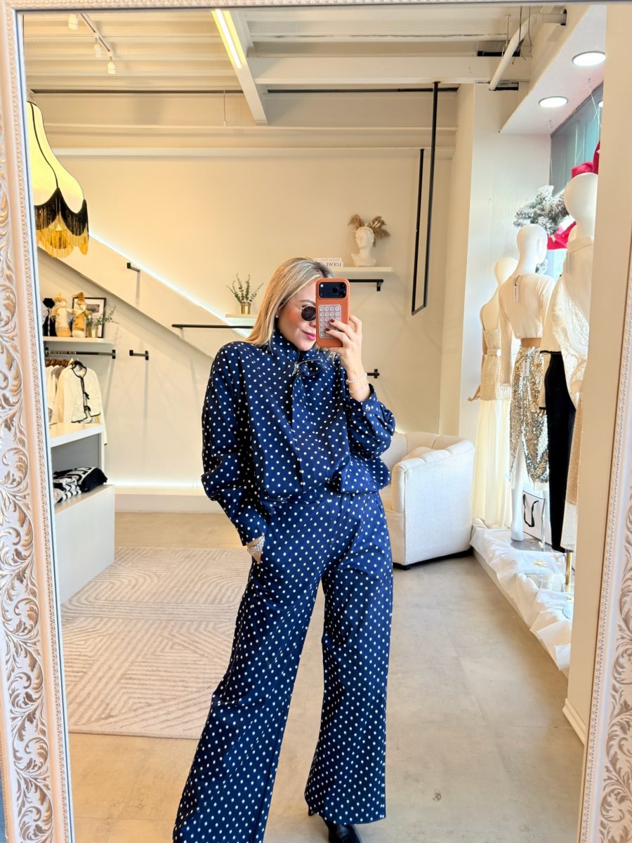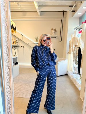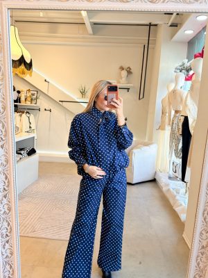 Conjunto jacket y pants polkadots azul con blanco tela de algodón