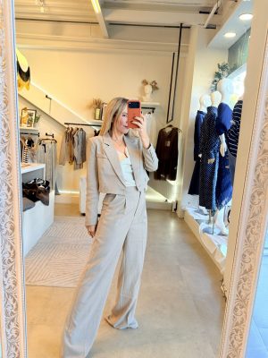 Conjunto color beige, con blazer corto y pantalones formal sin resorte.