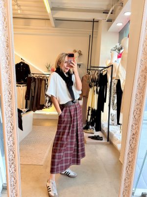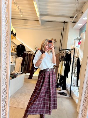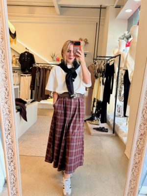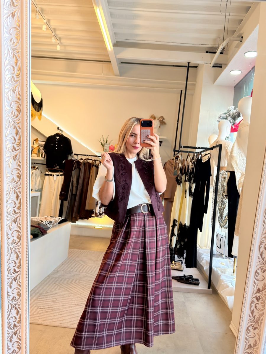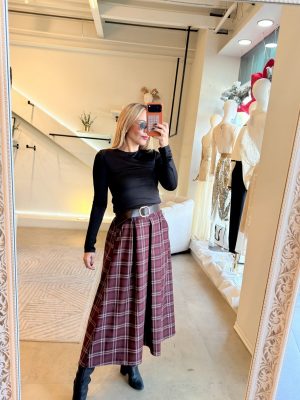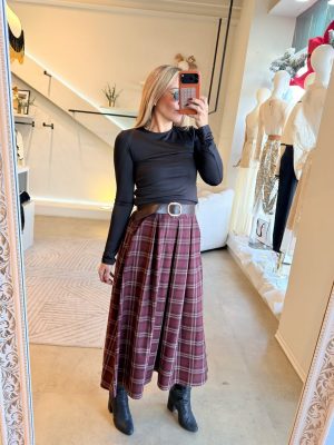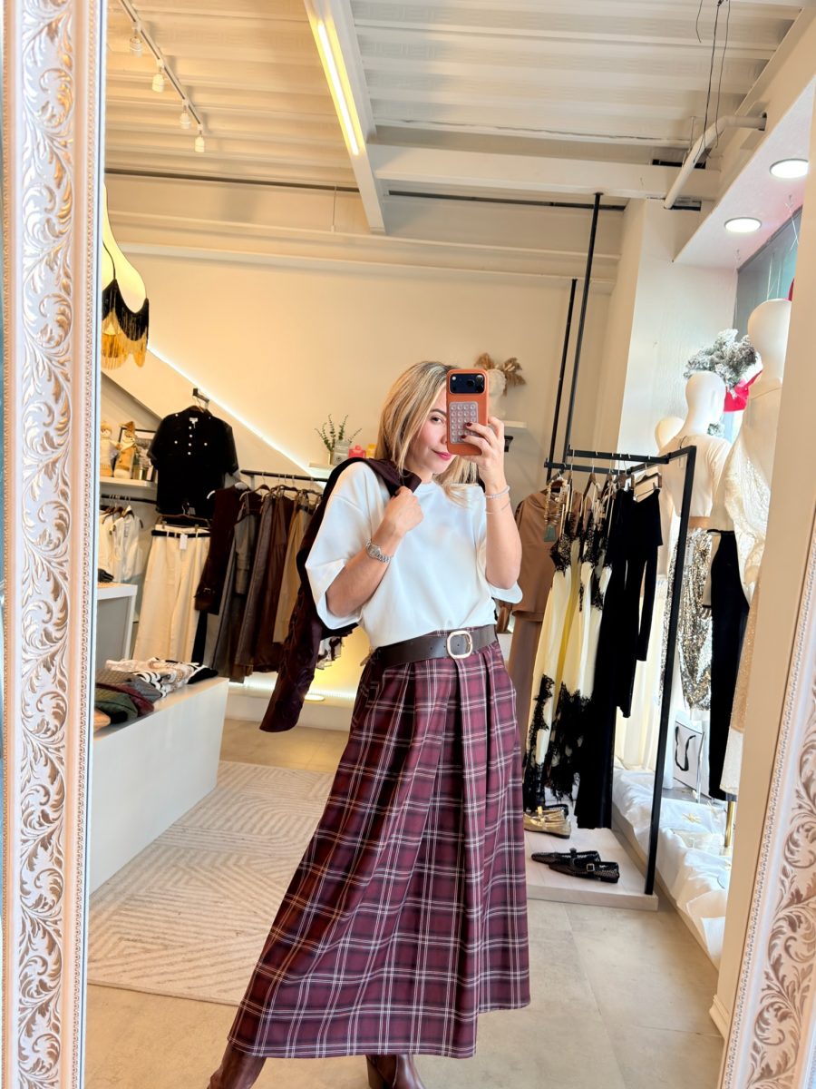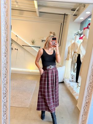 Falda midi burgundy con cuadros color blanco incluye cinturón cafe
