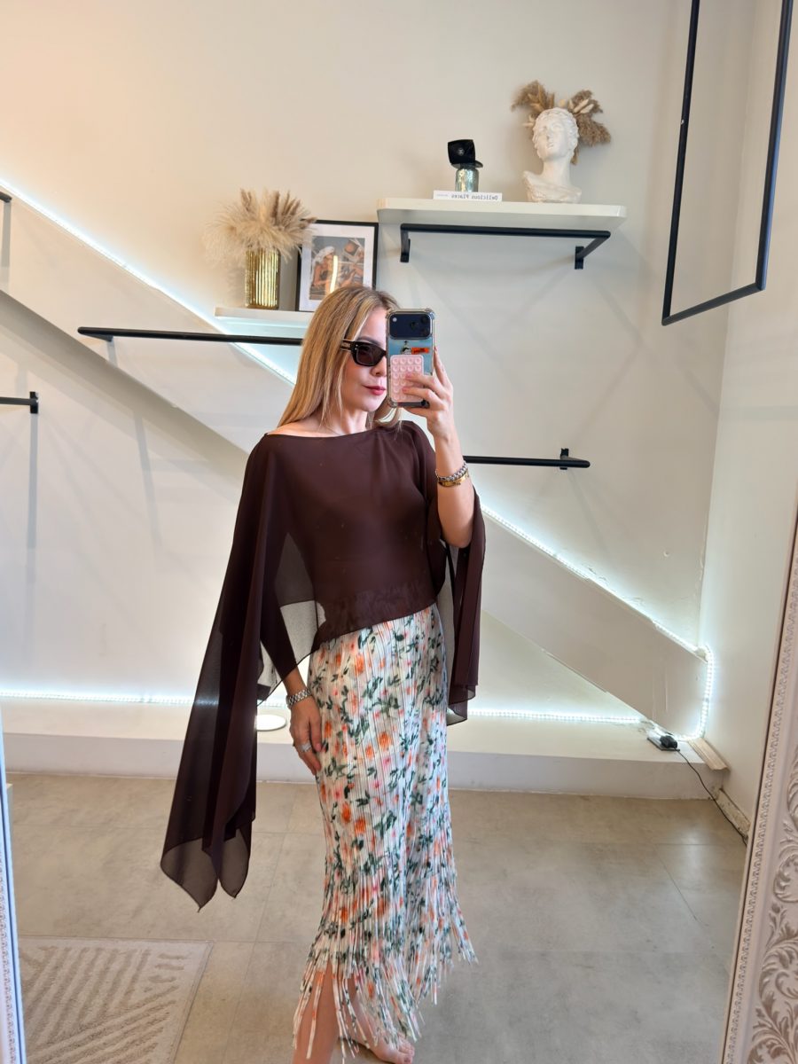 Falda midi color blanco con diseño de flores y efecto de flecos en la parte de abajo