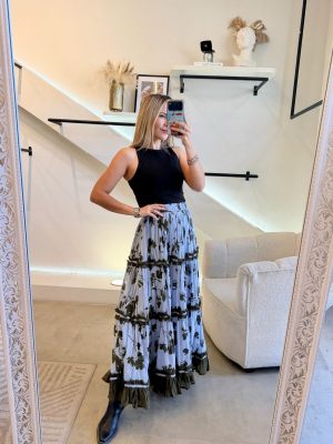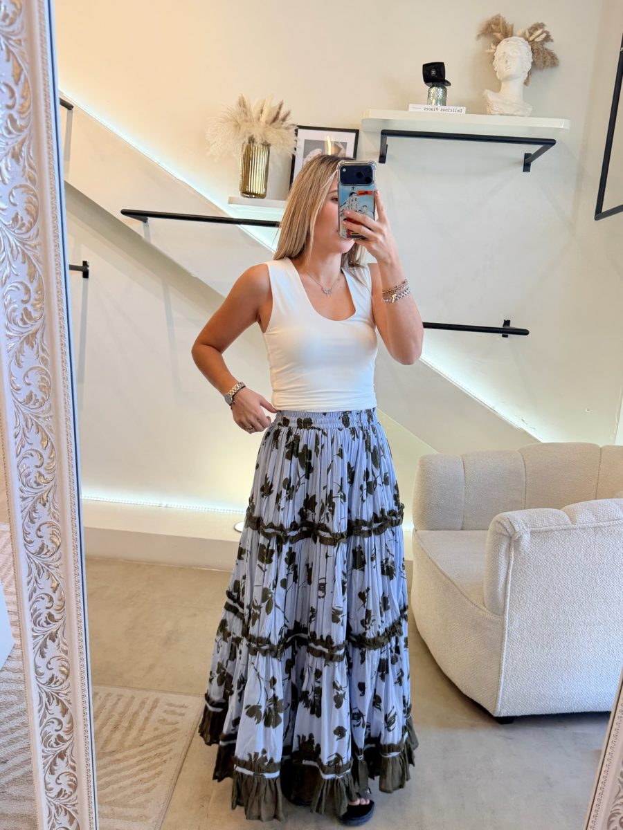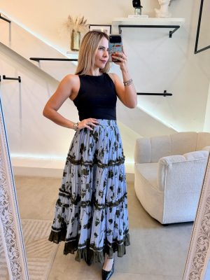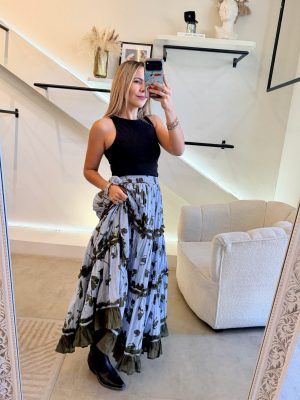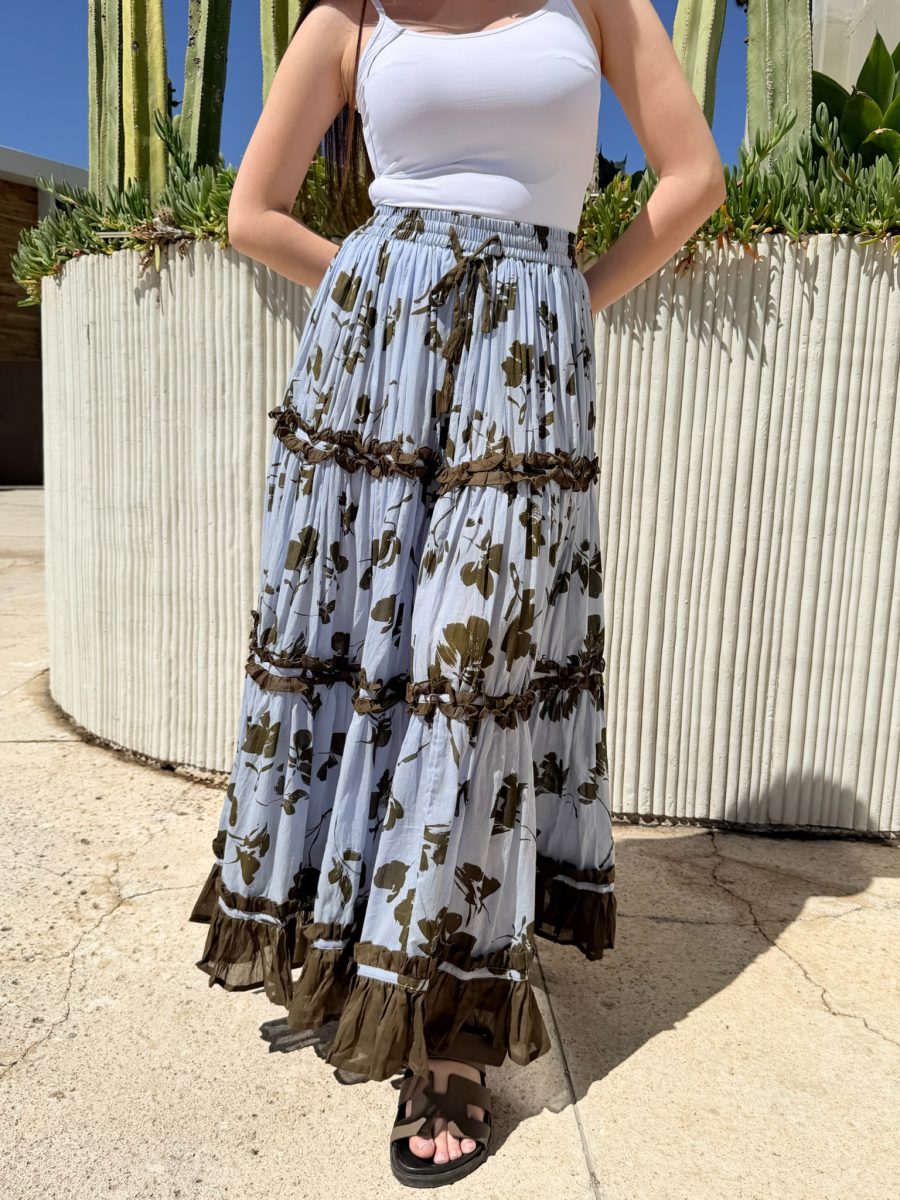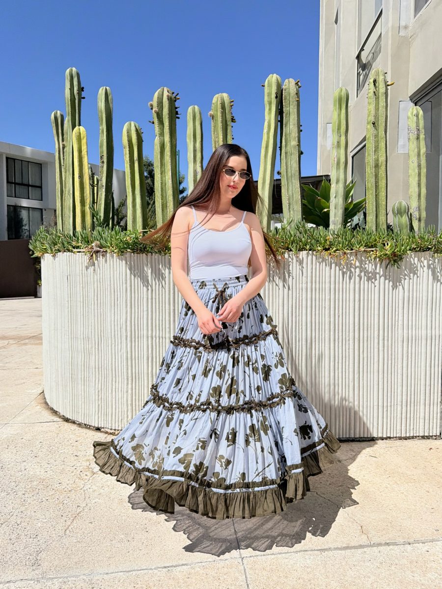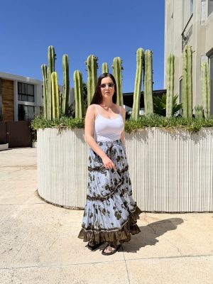 Falda larga azul con detalles en verde militar. Recorte en cintura