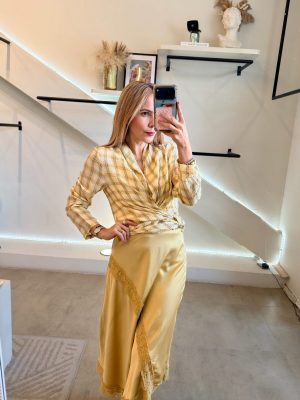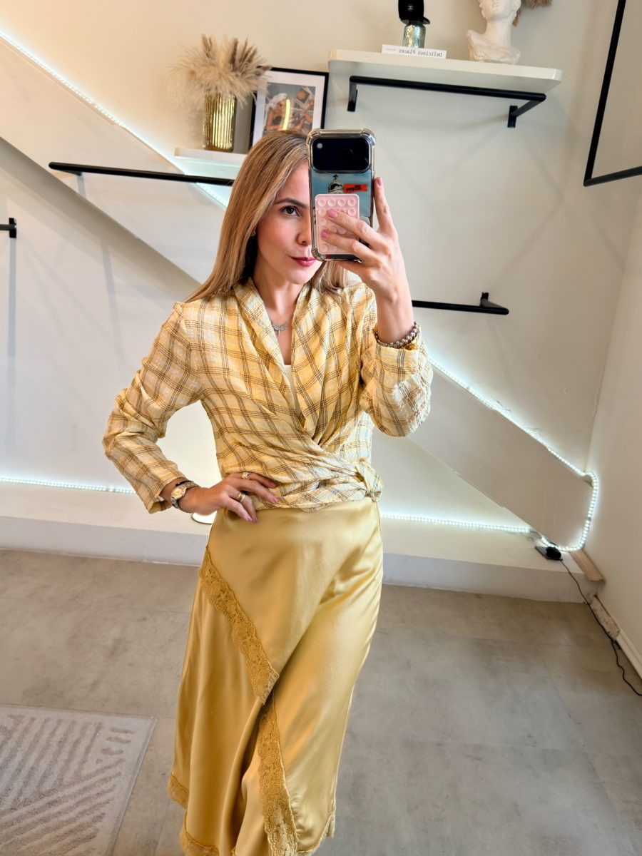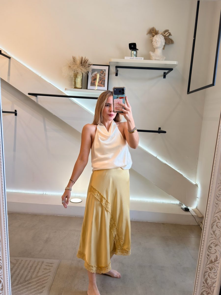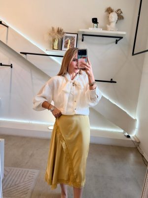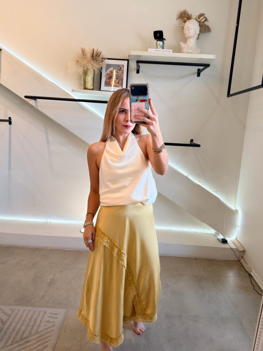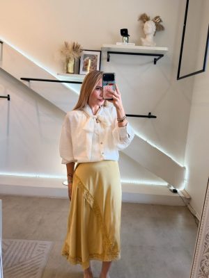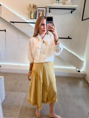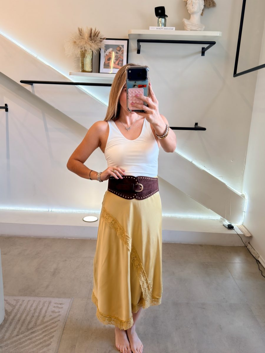 Falda midi asimétrica color amarillo mostaza con aplicaciones de encaje