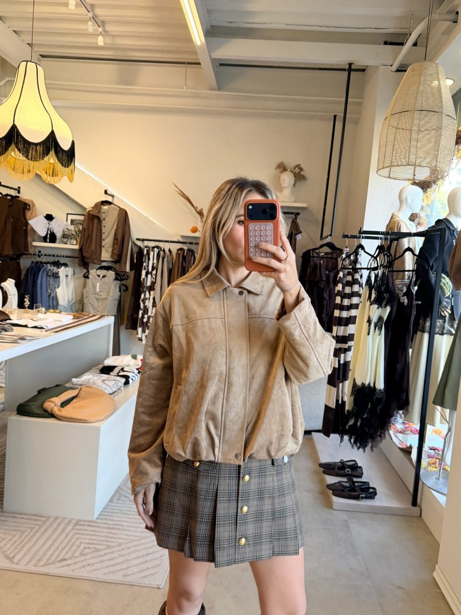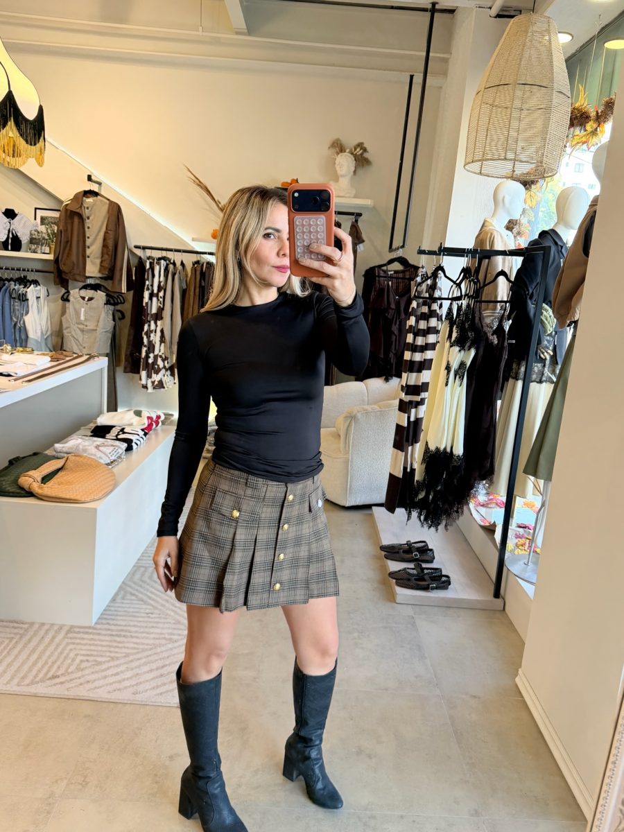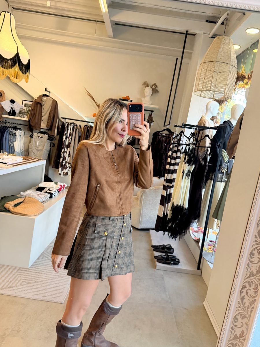 Short falda color café con cuadros y botones dorados en la parte de enfrente