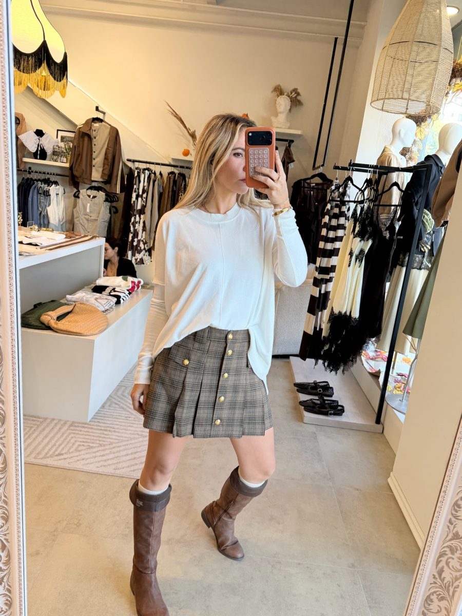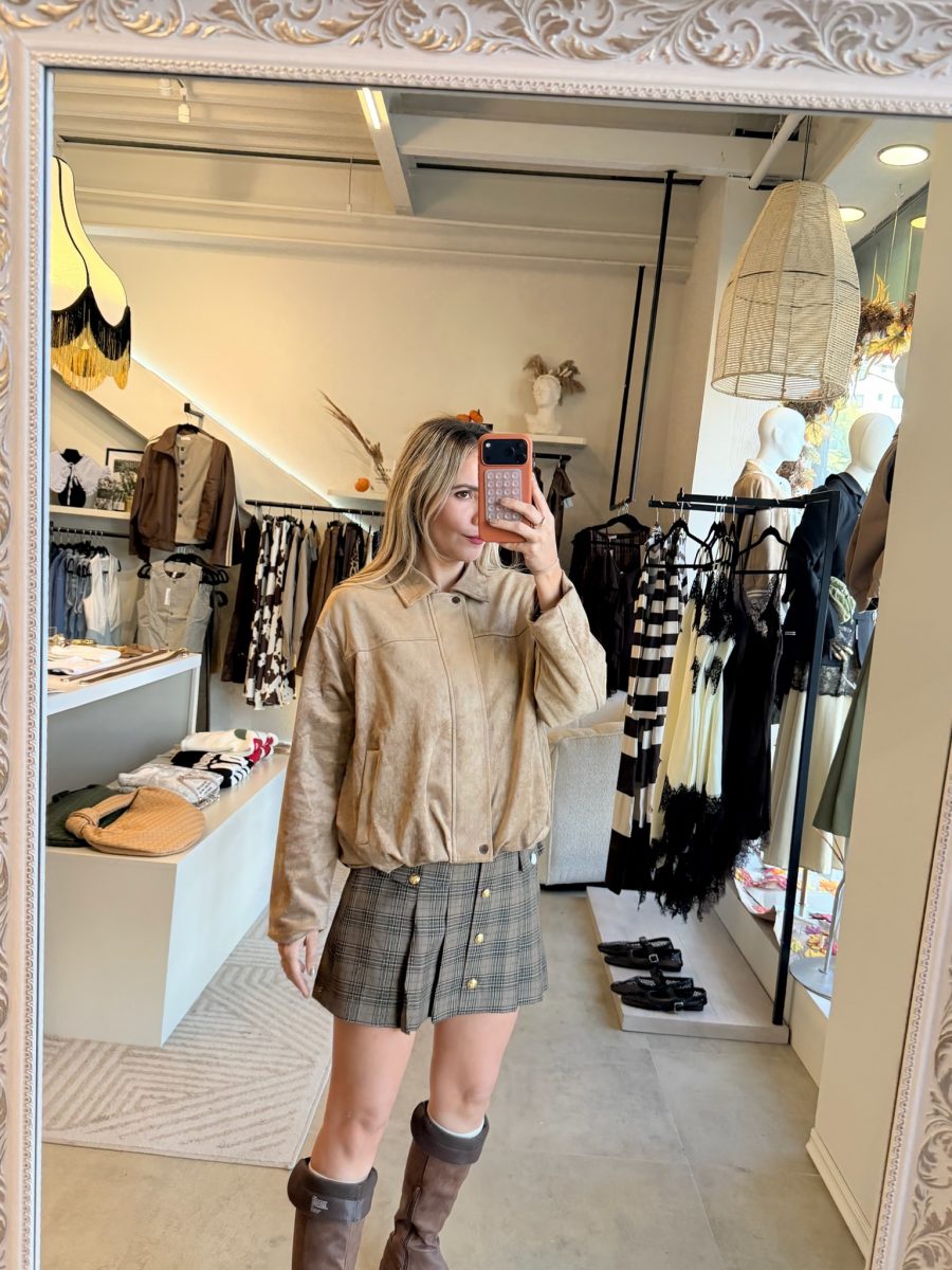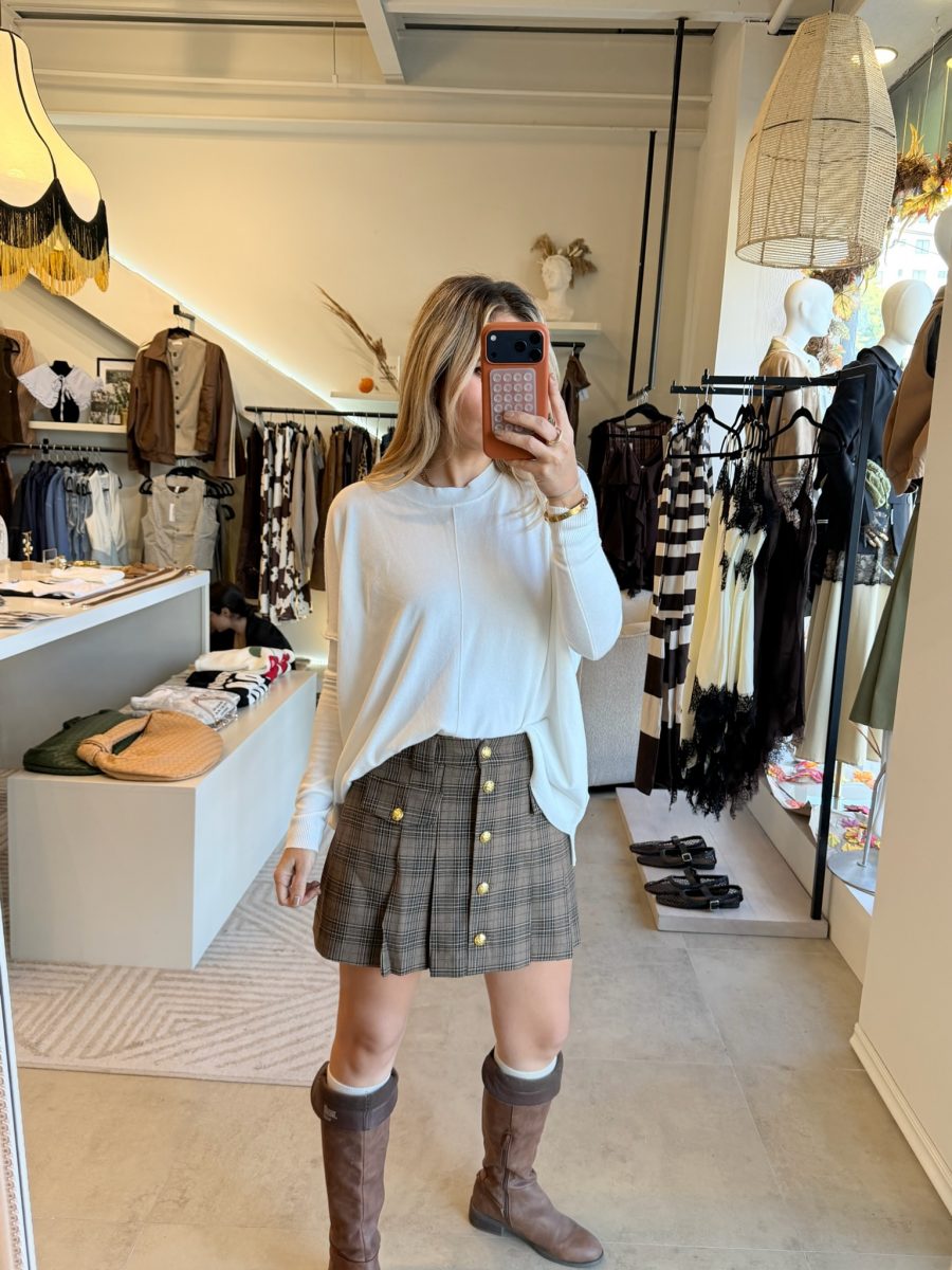 Short falda color café con cuadros y botones dorados en la parte de enfrente