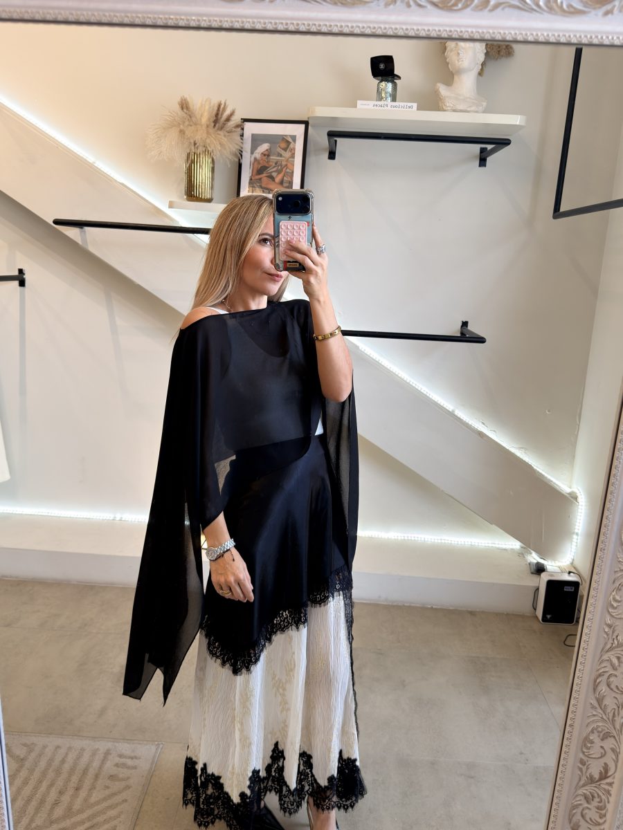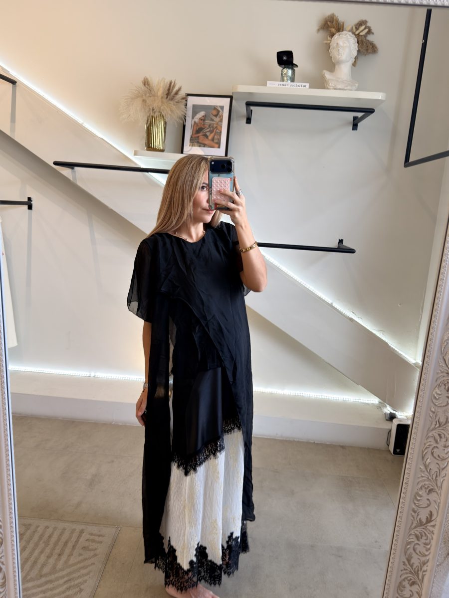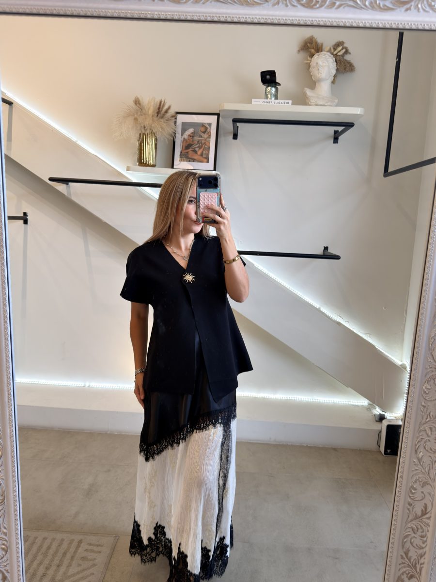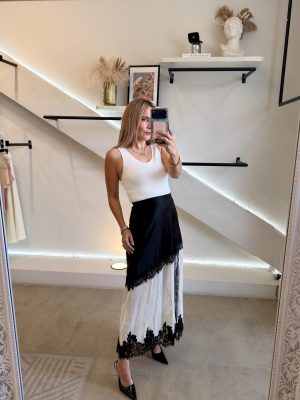Falda larga satinada con diseño plisado en color blanco y detalles dorados