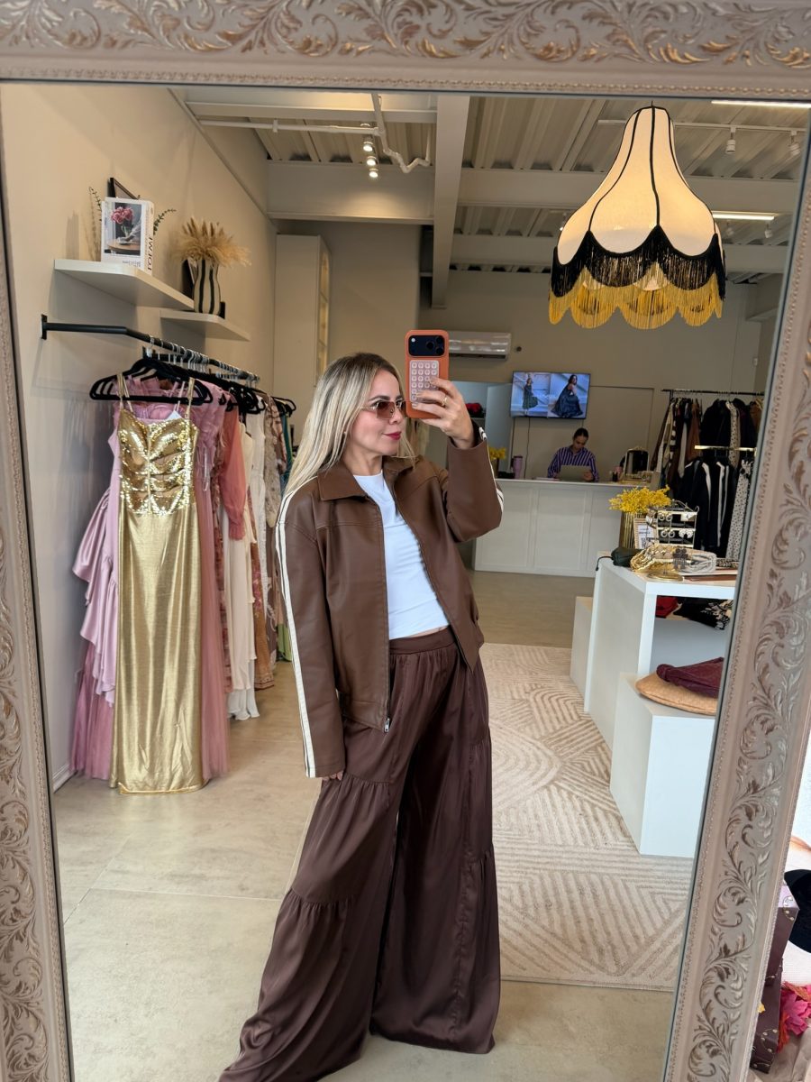 Jacket color café con rayas en brazos color beige, cierre en la parte de enfrente y bolsas.