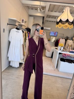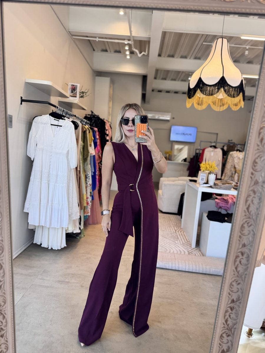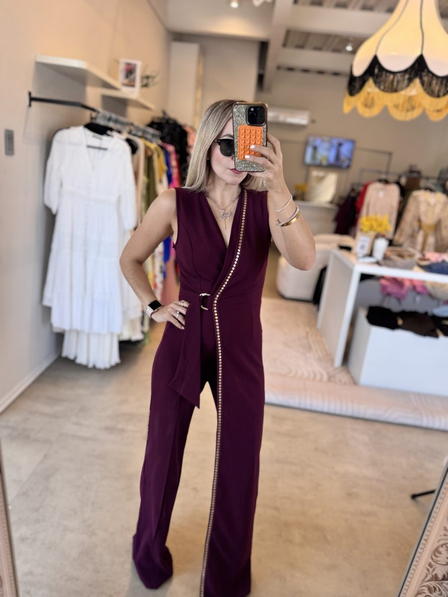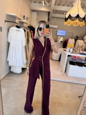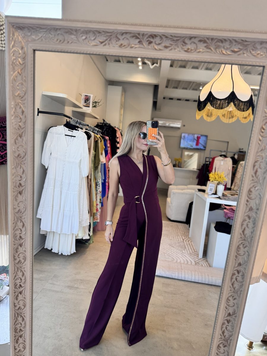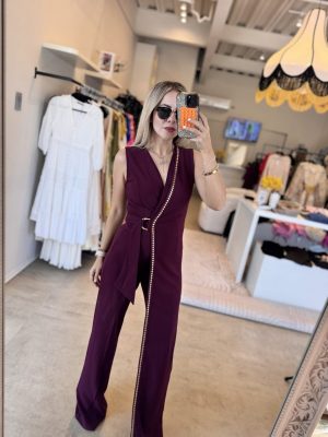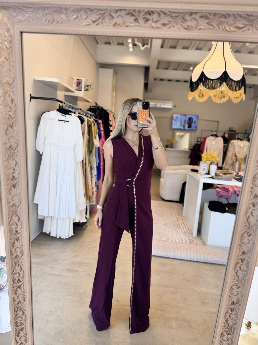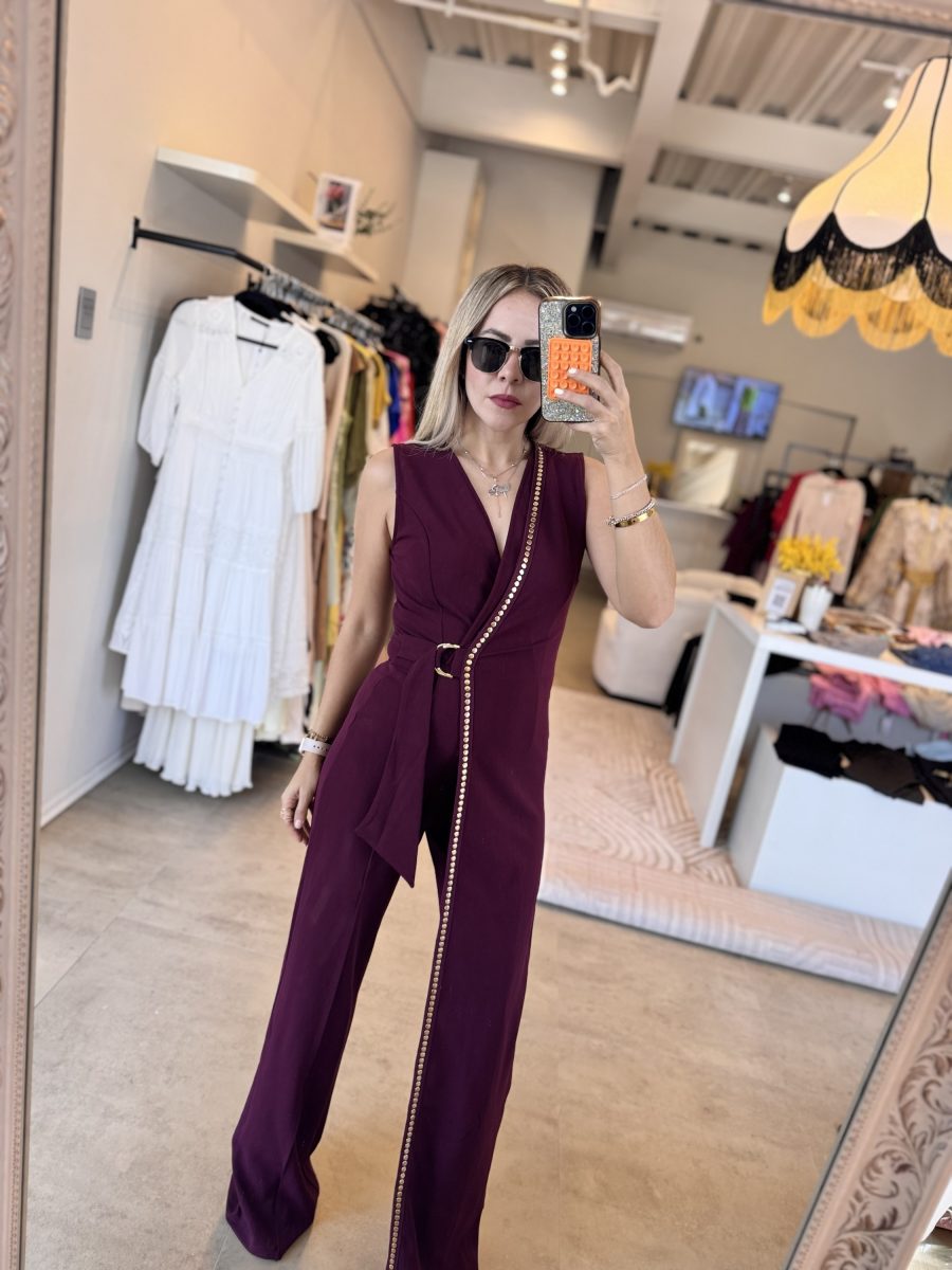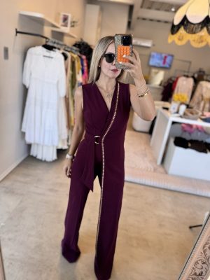 Palazzo asimétrico color burgundy con aplicaciones color dorado tela stretch
