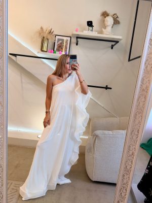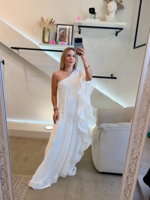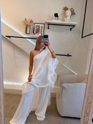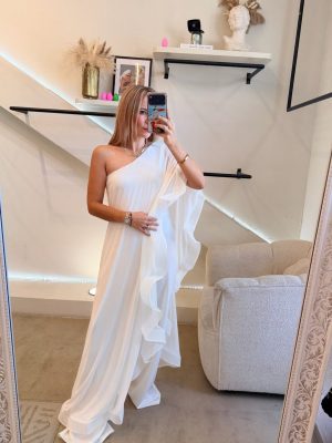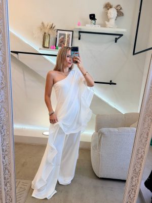 Palazzo one shoulder tela mesh color blanco con Olanes