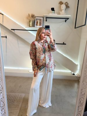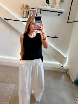 Pantalón recto color ivory tela satinada con bolsas