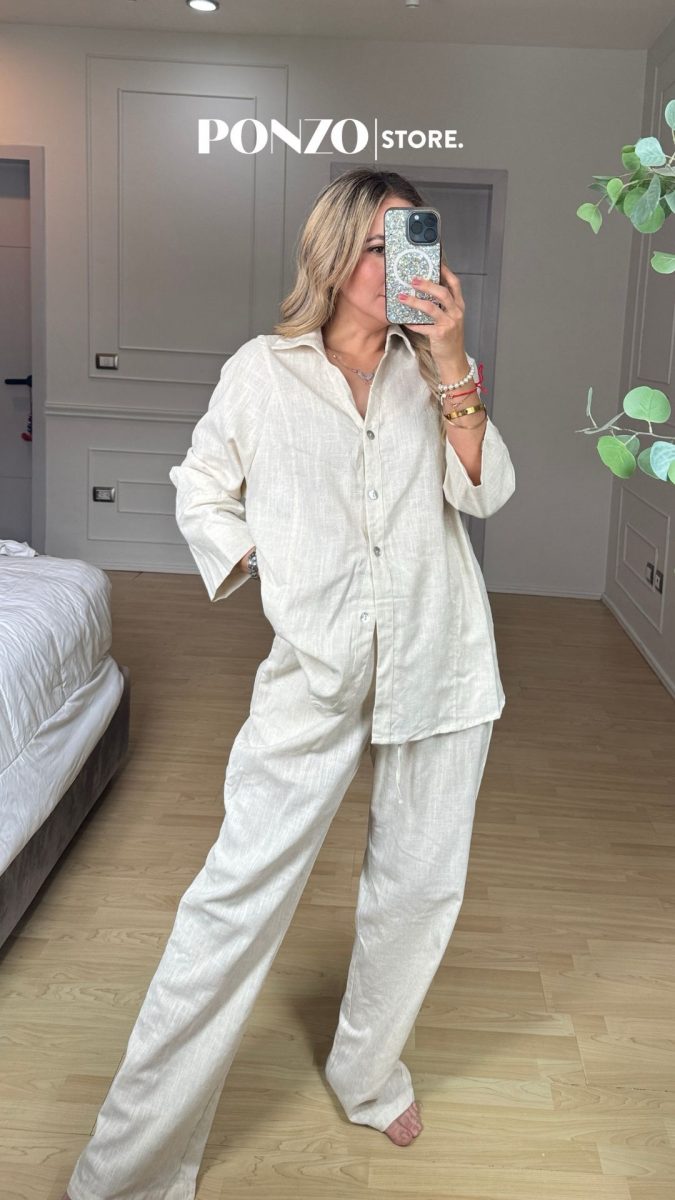 Pantalón wide leg tela de lino color crudo elástico en cintura