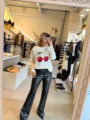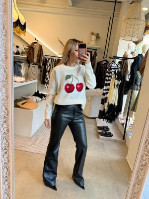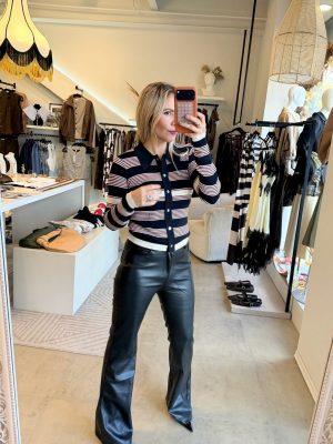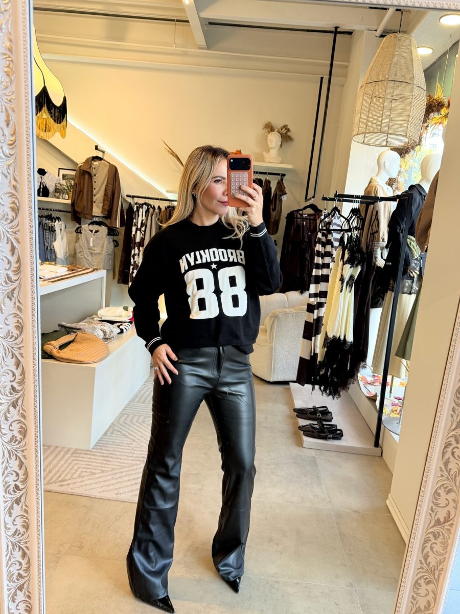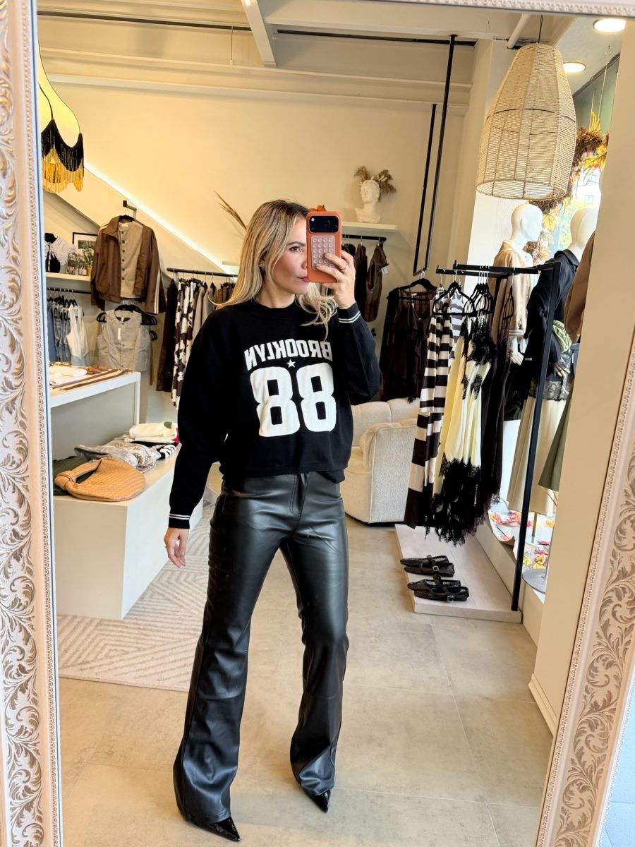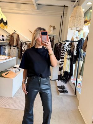 Pantalón color negro tipo cuero con botón en la parte de enfrente