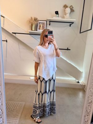Pantalón español efecto plisado color ivory con diseño azul Garigol