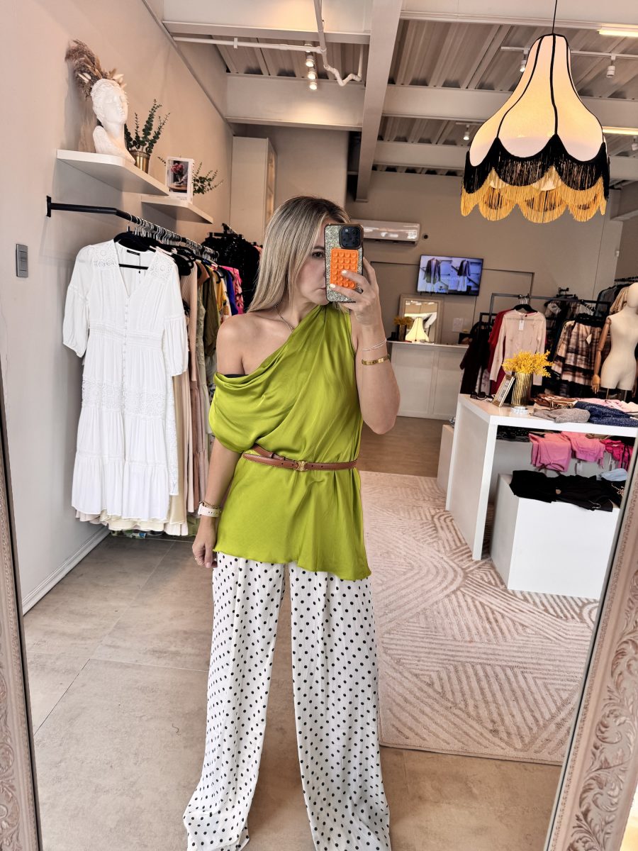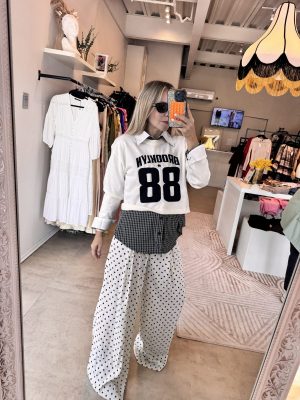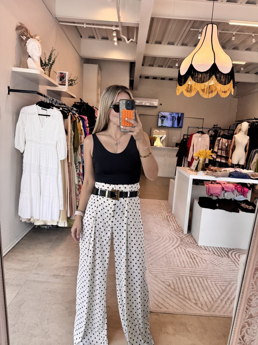 Pantalón holgado color blanco con estampado lunares negro, elástico en cintura