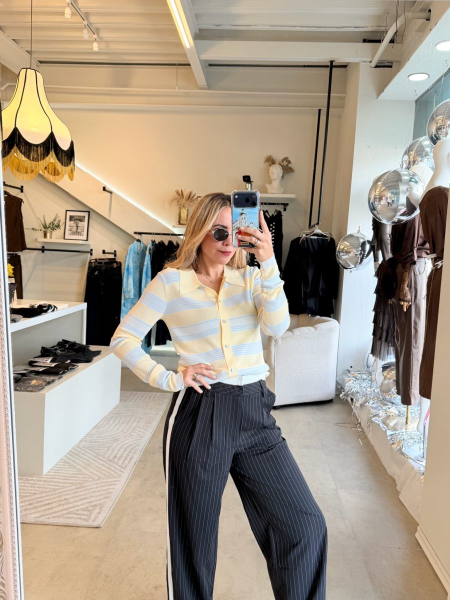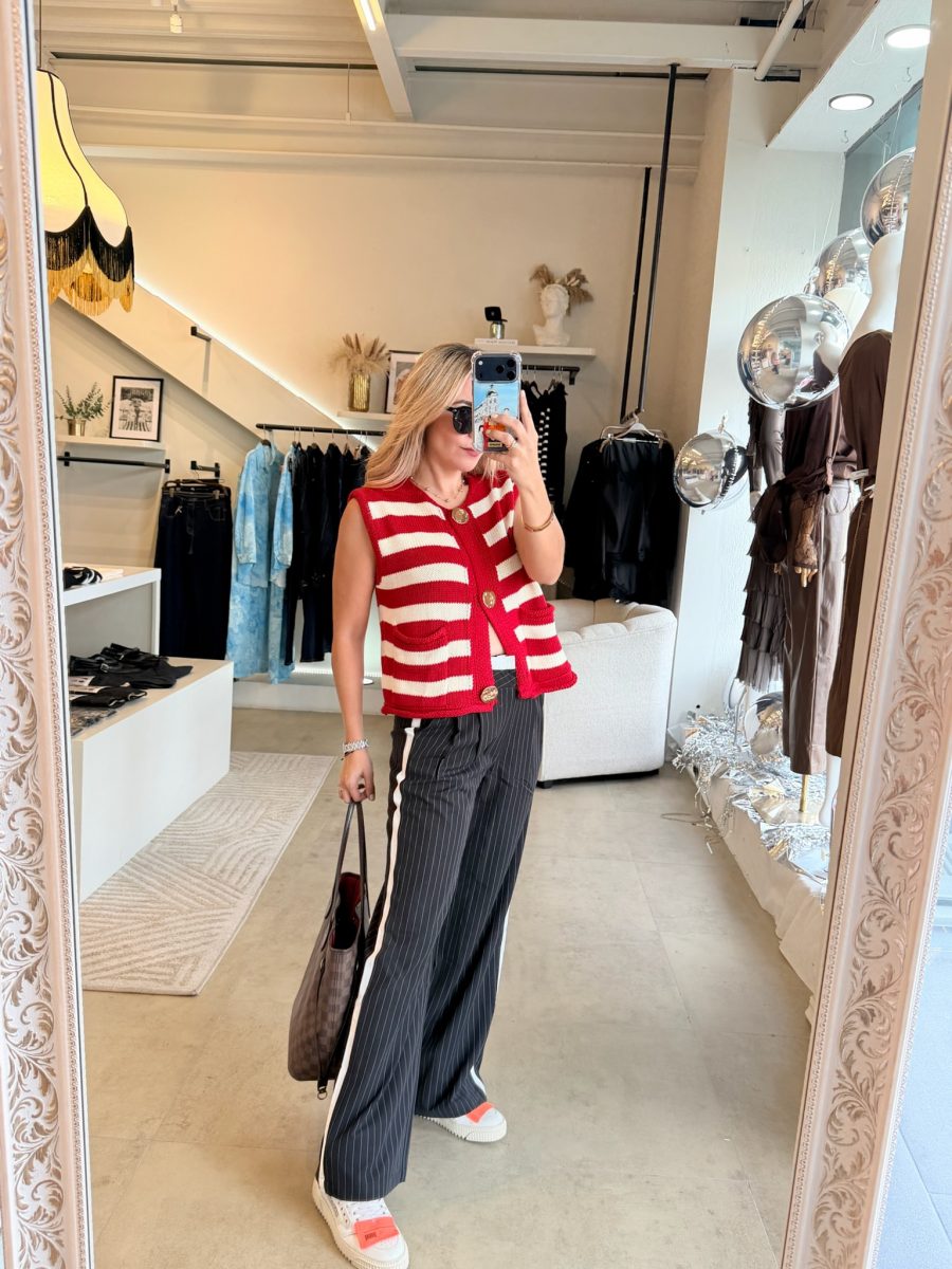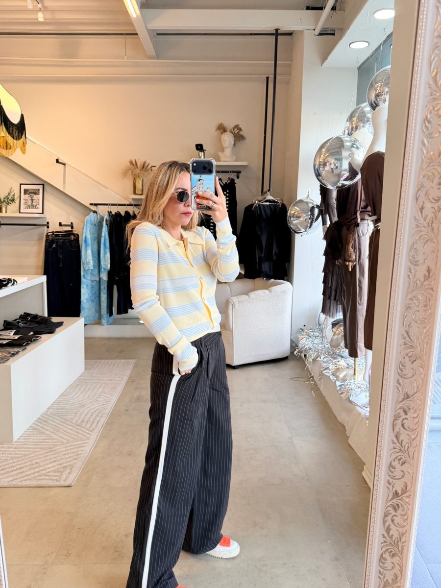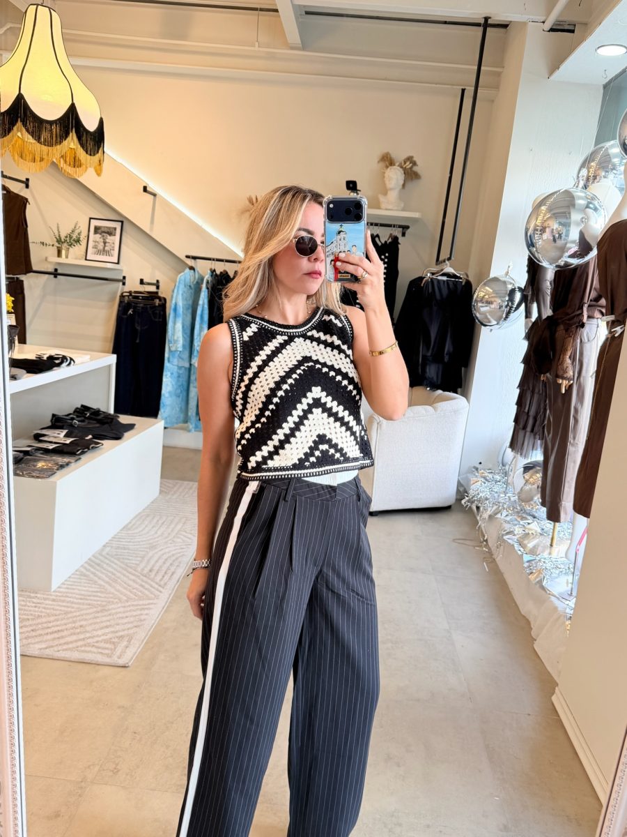 Pantalón negro con rayas blancas y diseño de doble pantalón en la parte de arriba color blanco
