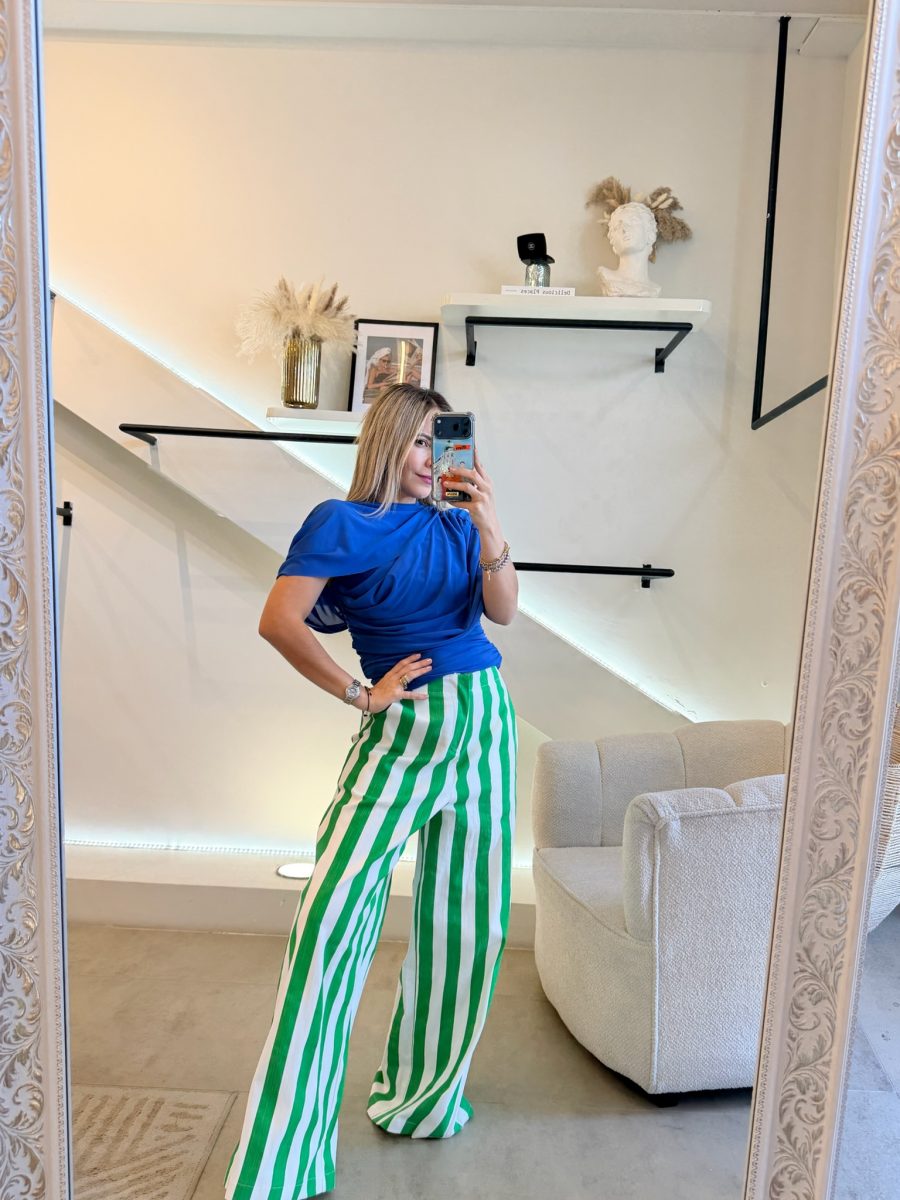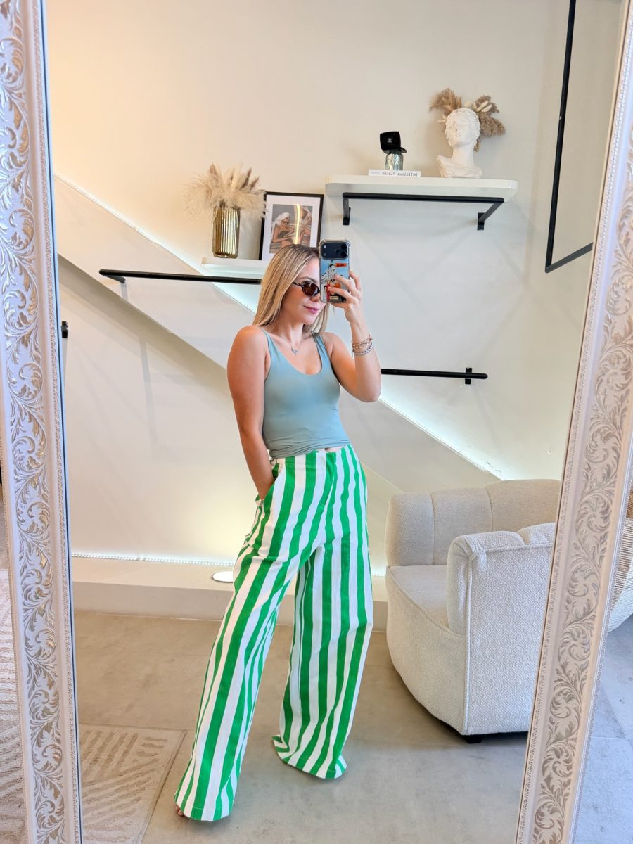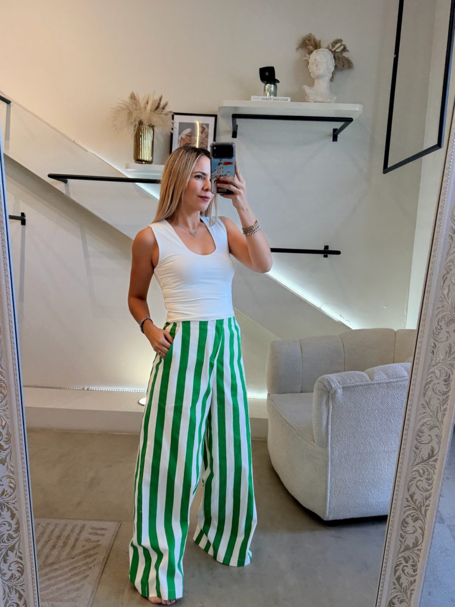 Pantalón recto estampado rayas verticales color verde y blanco tela algodón con spandex