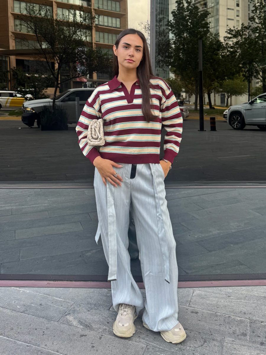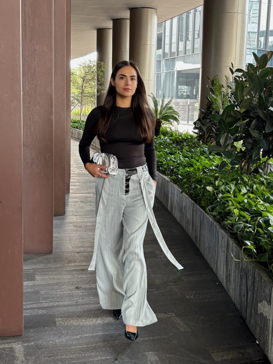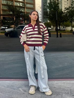 Pantalón recto Wide leg color azul cielo con rayas color negro