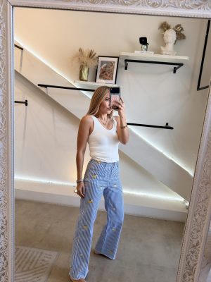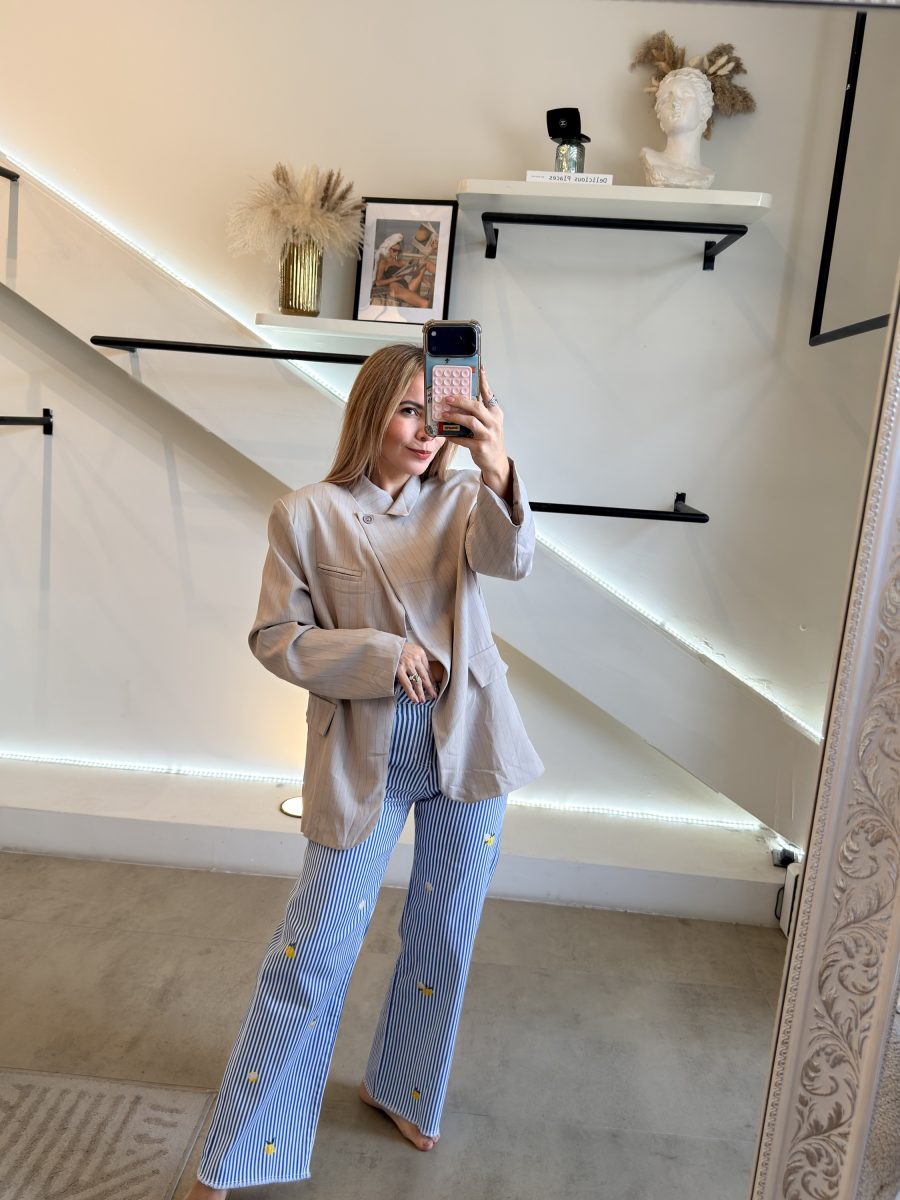 Pantalón recto de mezclilla con diseño de rayas azules y bordado de limones.