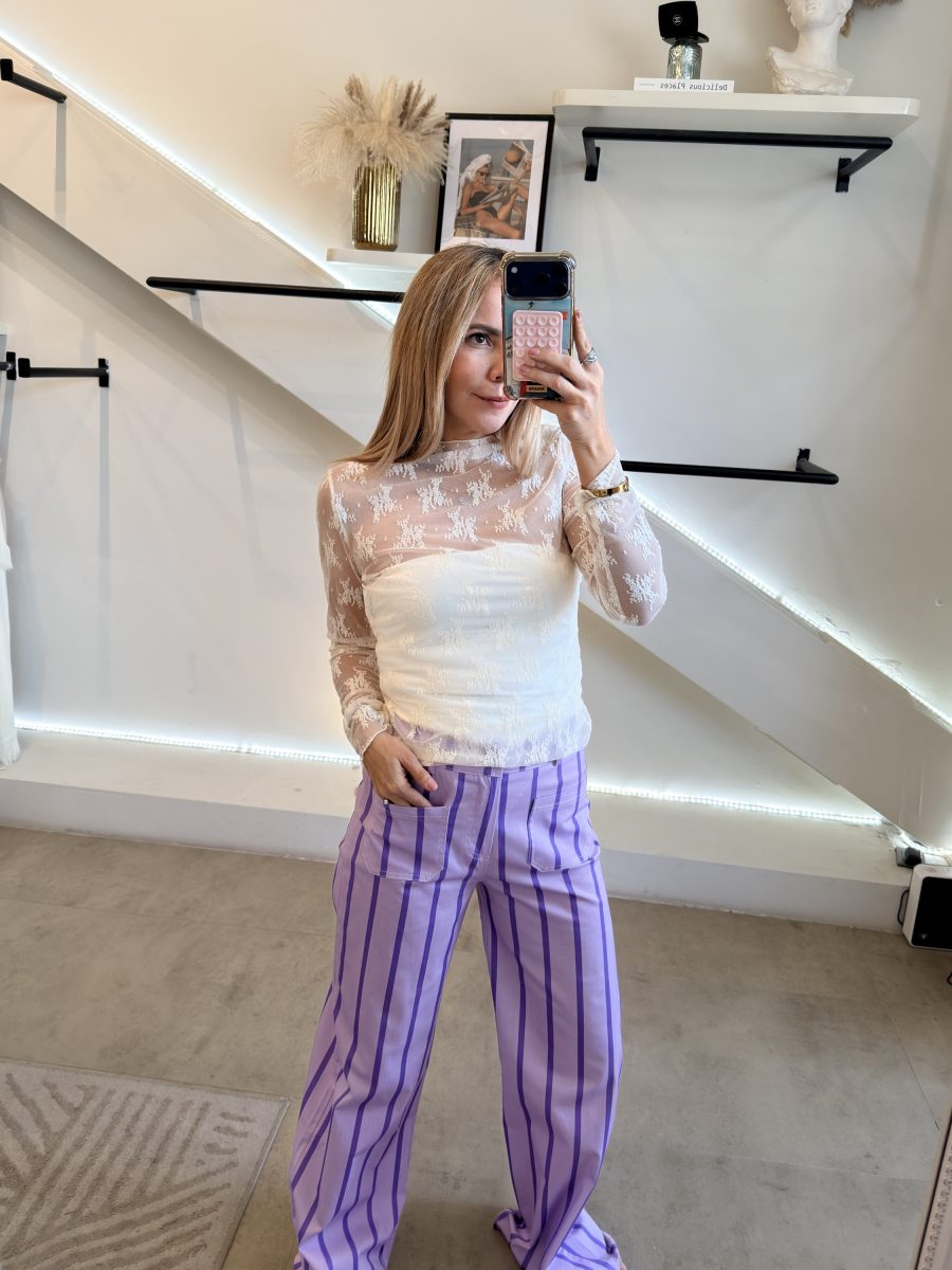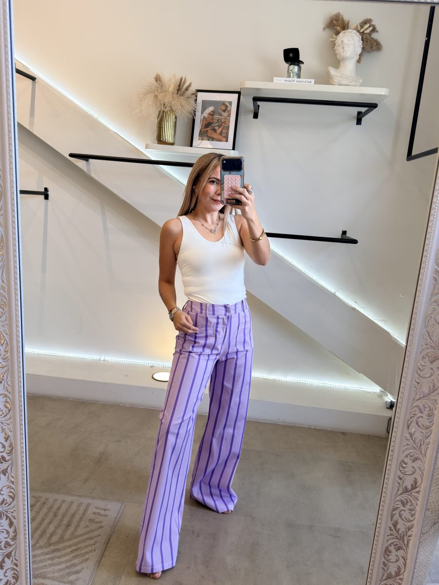 Pantalón diseño barrel de color morado con líneas moradas
