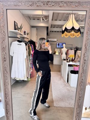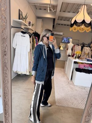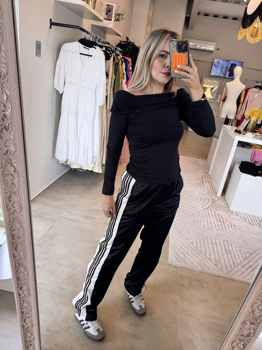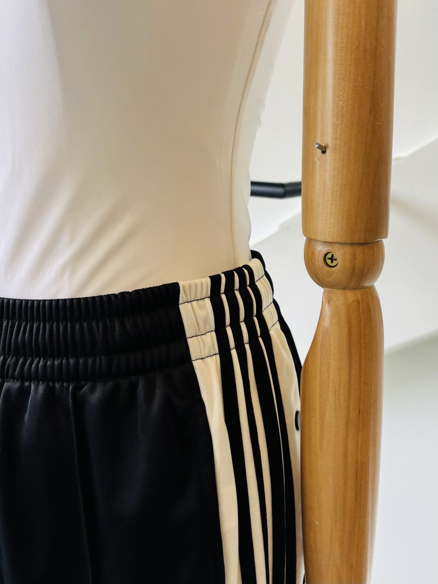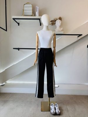 Pantalón tipo pants color negro con franjas a los lados color blanco y botones