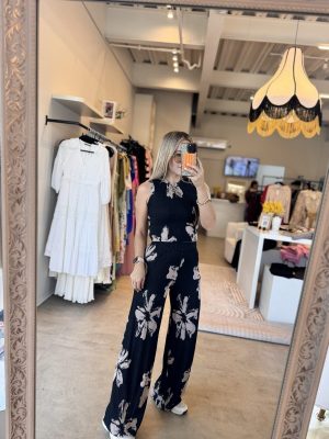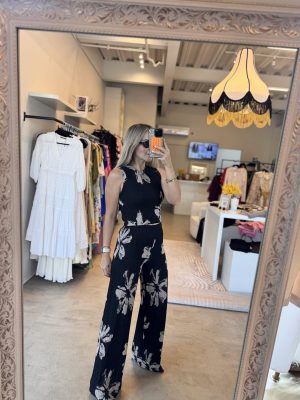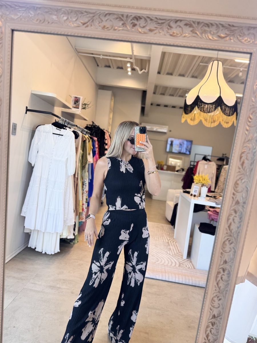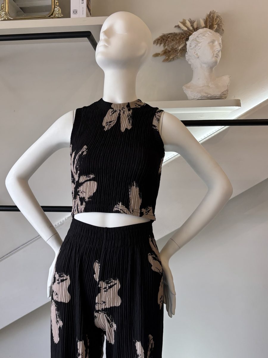 Conjunto blusa y pantalón tela plisada color negro con estampado floral