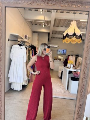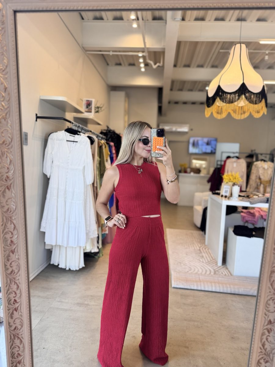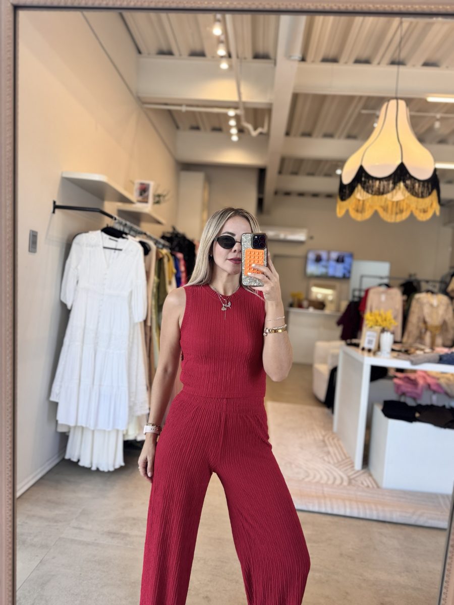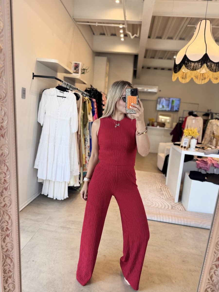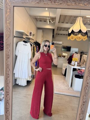 Conjunto blusa y pantalón tela plisada color rojo elástico en cintura