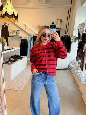 Suéter rojo con líneas negras y botones dorados