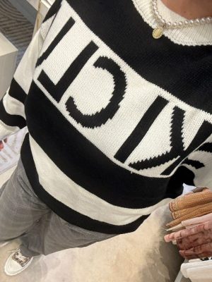 Suéter delgado cuello redondo tejido con letras al frente color blanco y negro