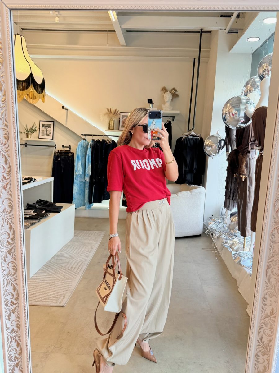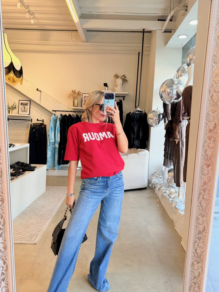 T shirt tela de algodón color rojo con letrero al frente color blanco con letras AMOUR