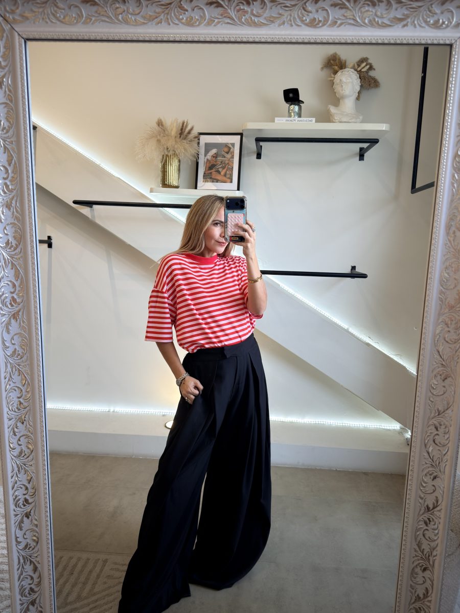 T shirt básica en tendencia con diseño de líneas rojas con rosa