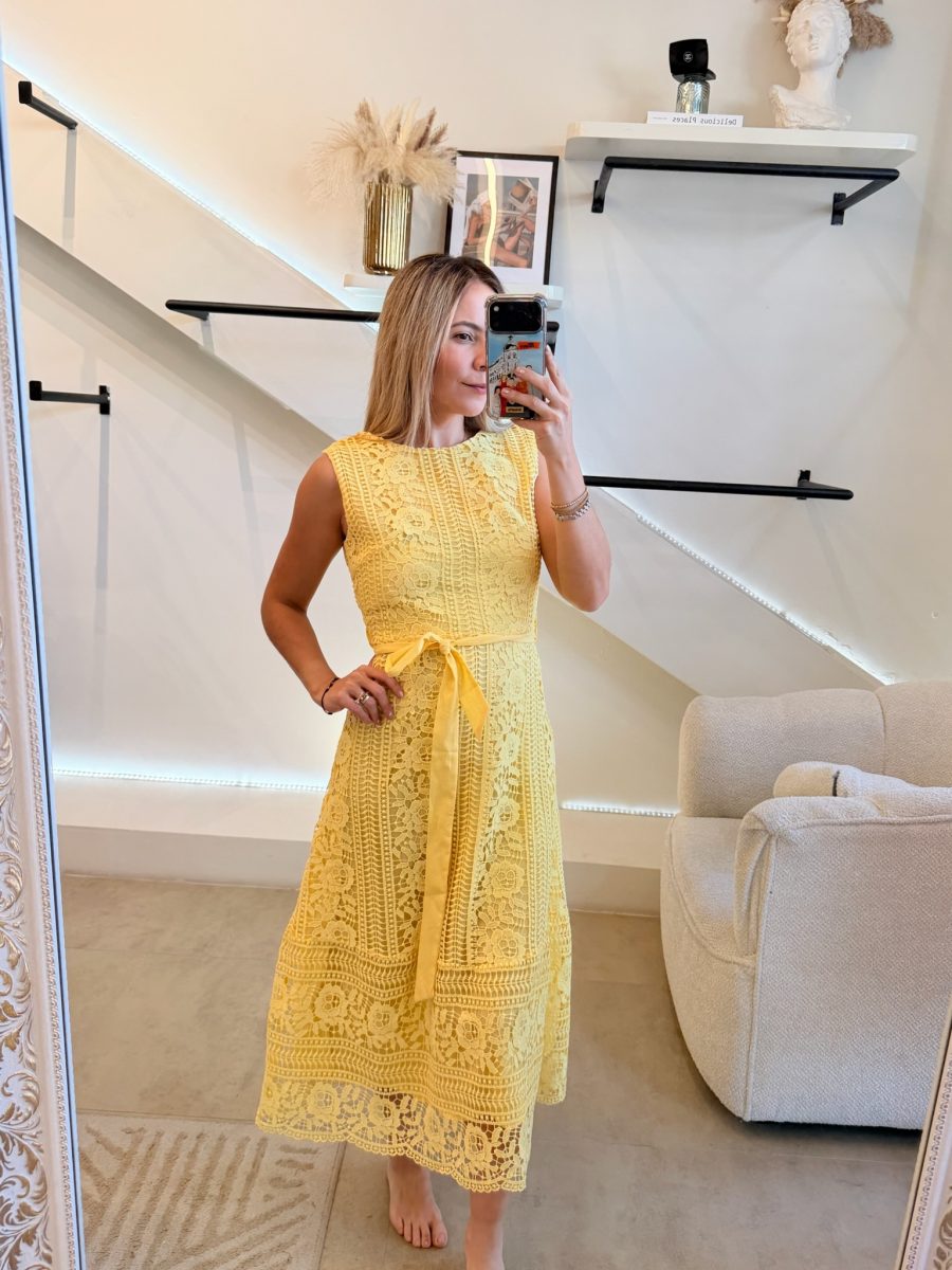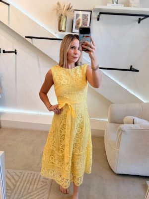 Vestido midi sin manga tela crochet con forro color amarillo , cierre en espalda