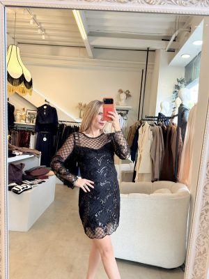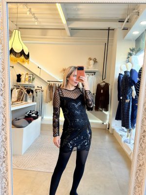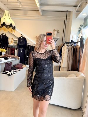 Vestido corto manga larga con transparencias y aplicaciones en color negro