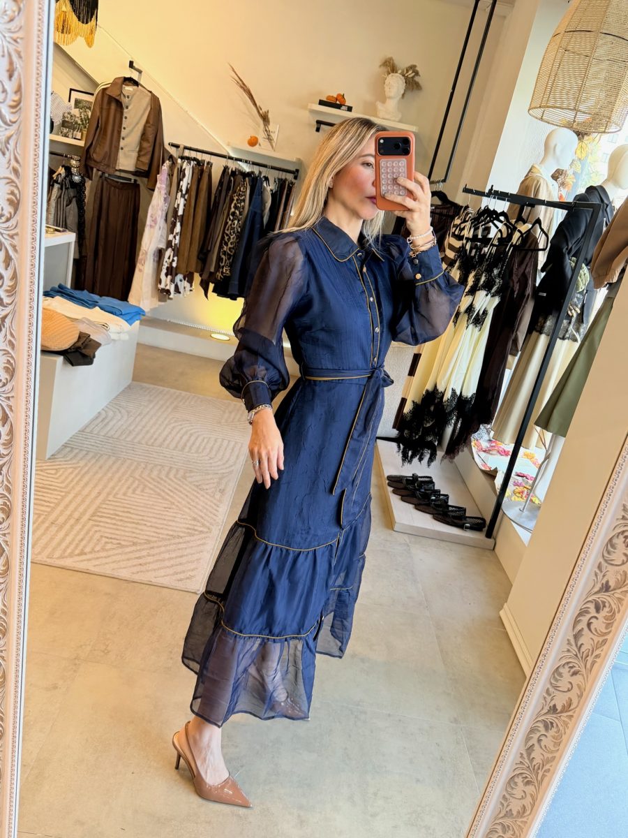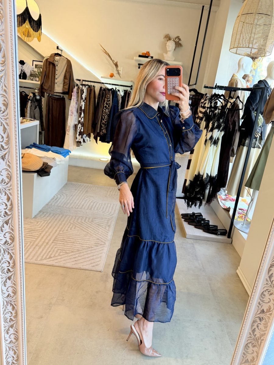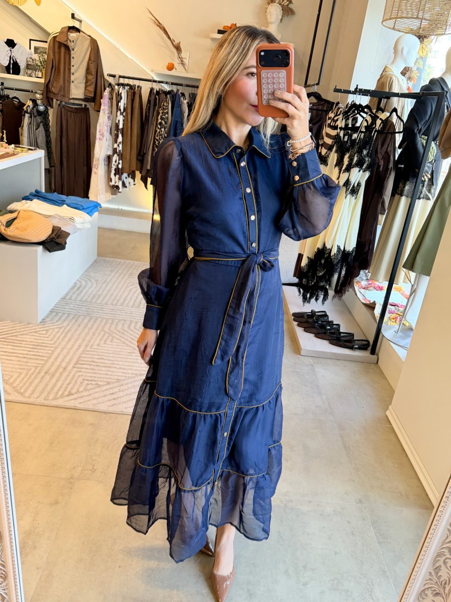 Vestido largo color azul marino, con líneas en amarillo, tela traslúcida en brazos y botones dorados en la parte de enfrente.