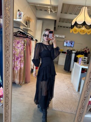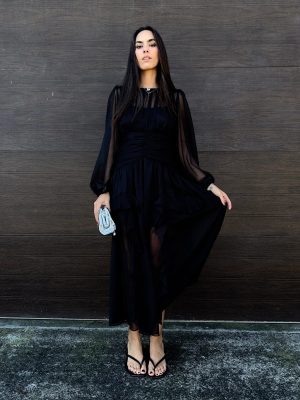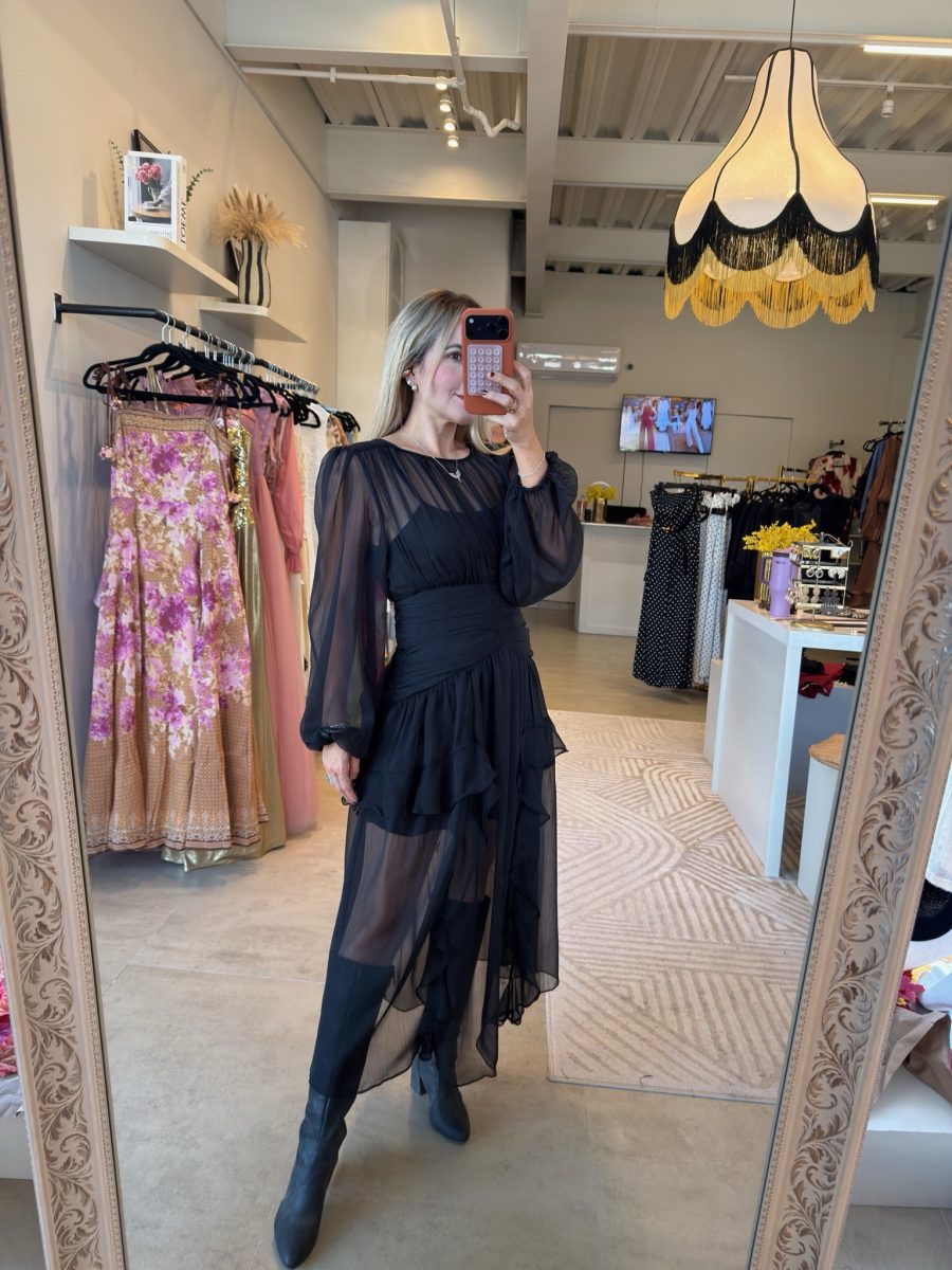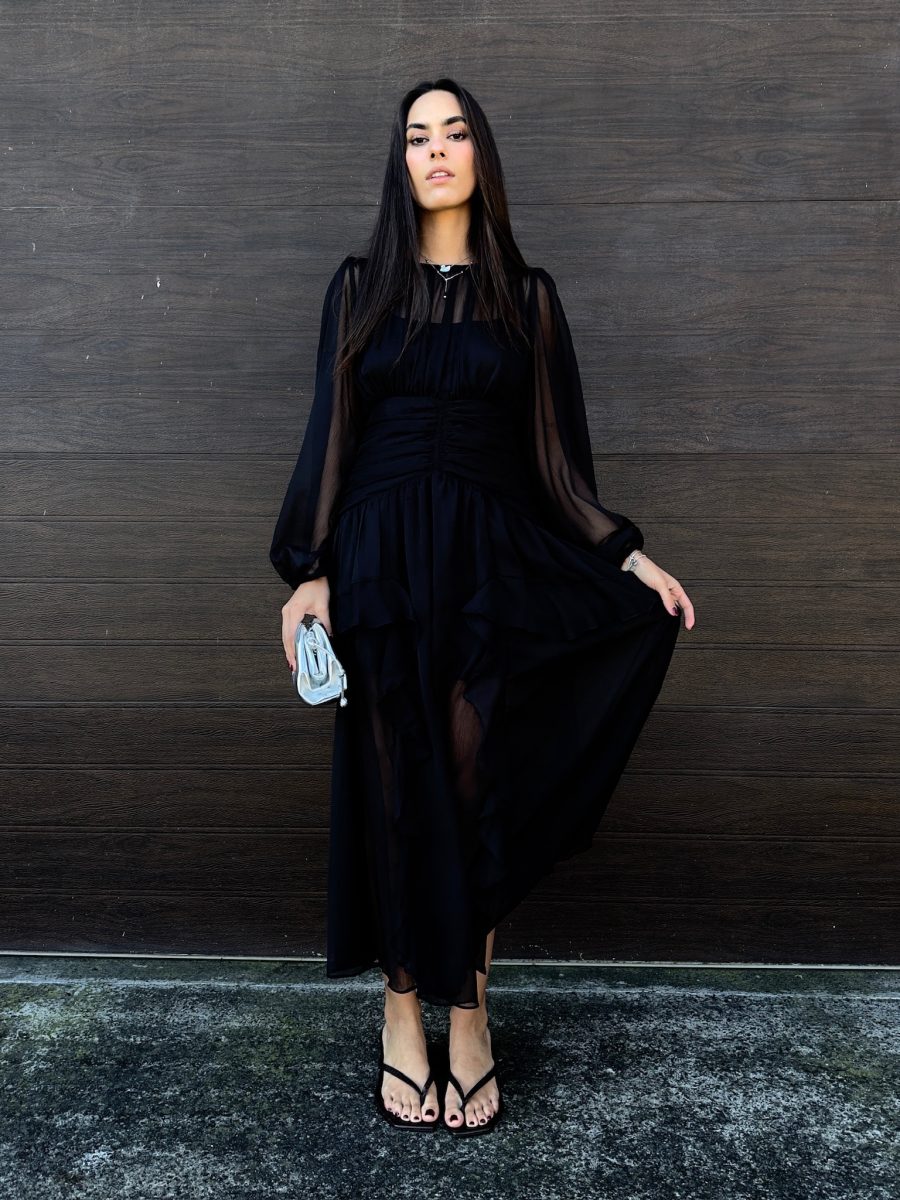 Vestido largo transparente, color negro con detalle en cintura y manga larga