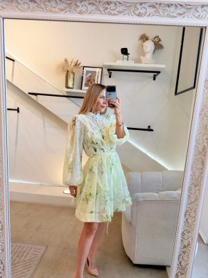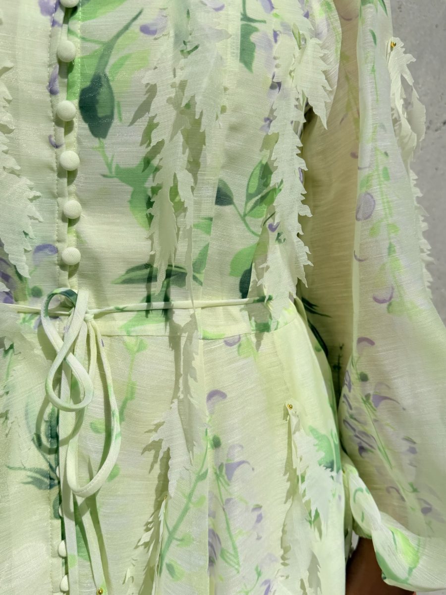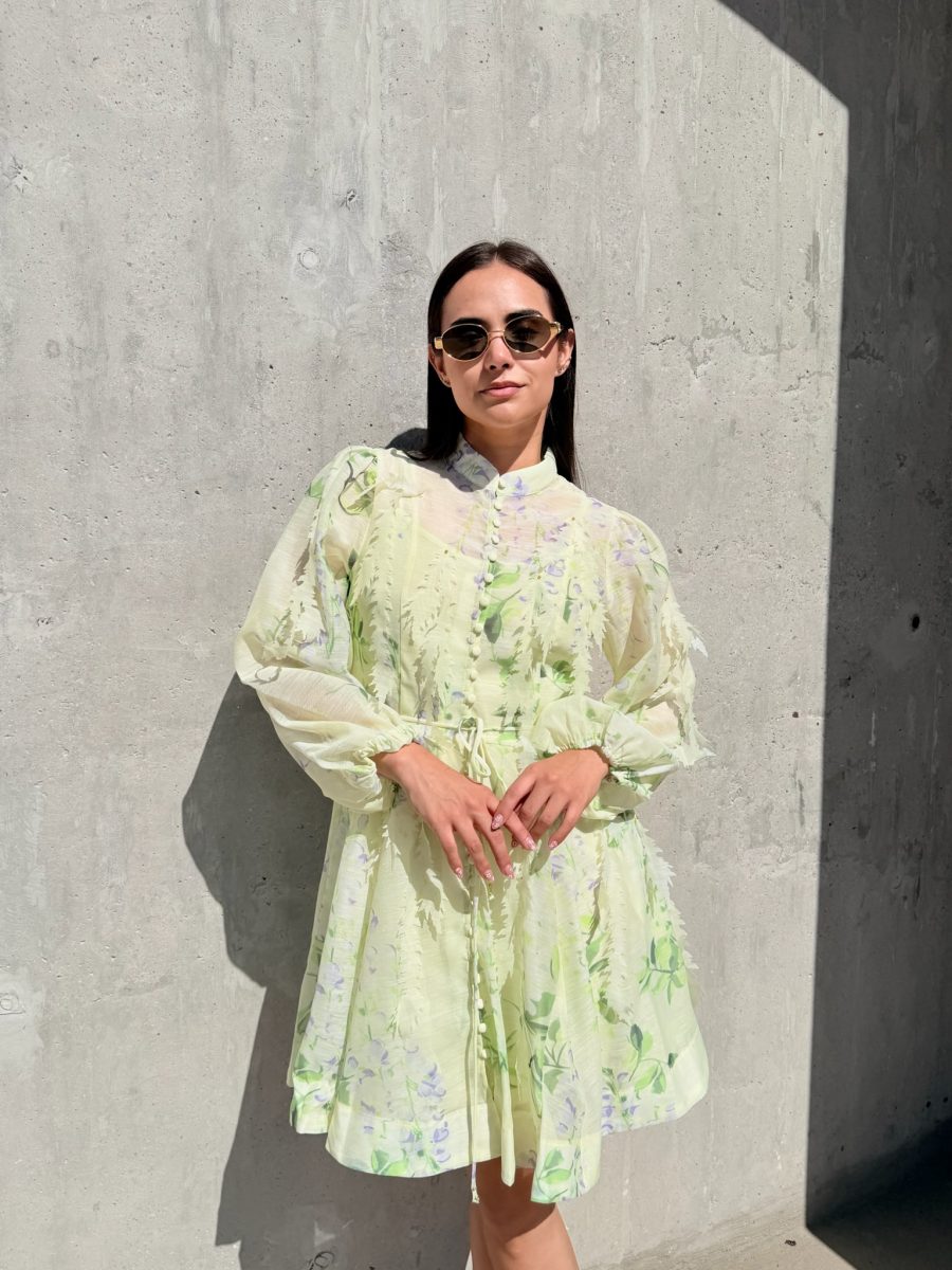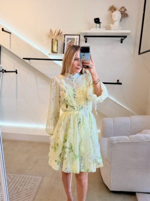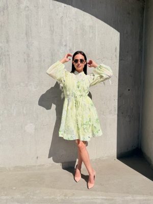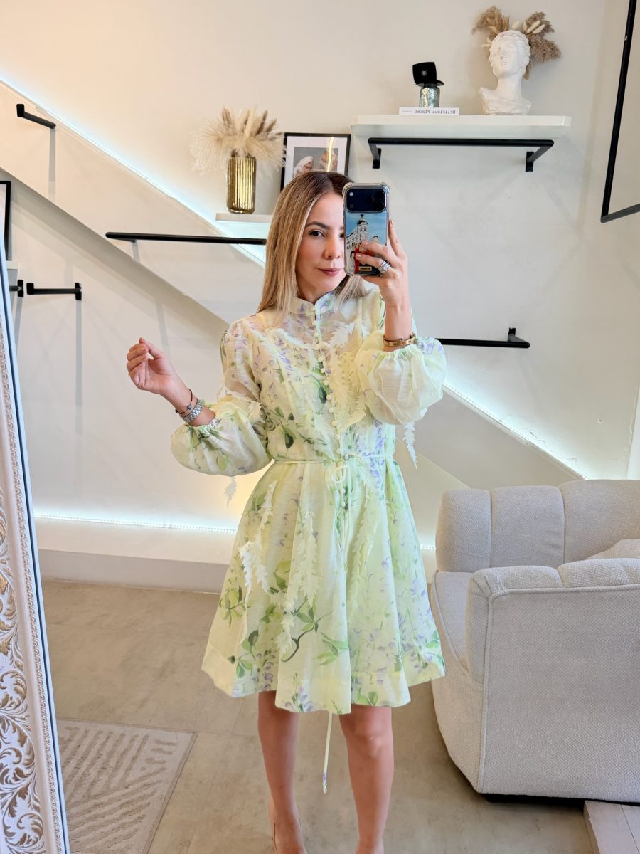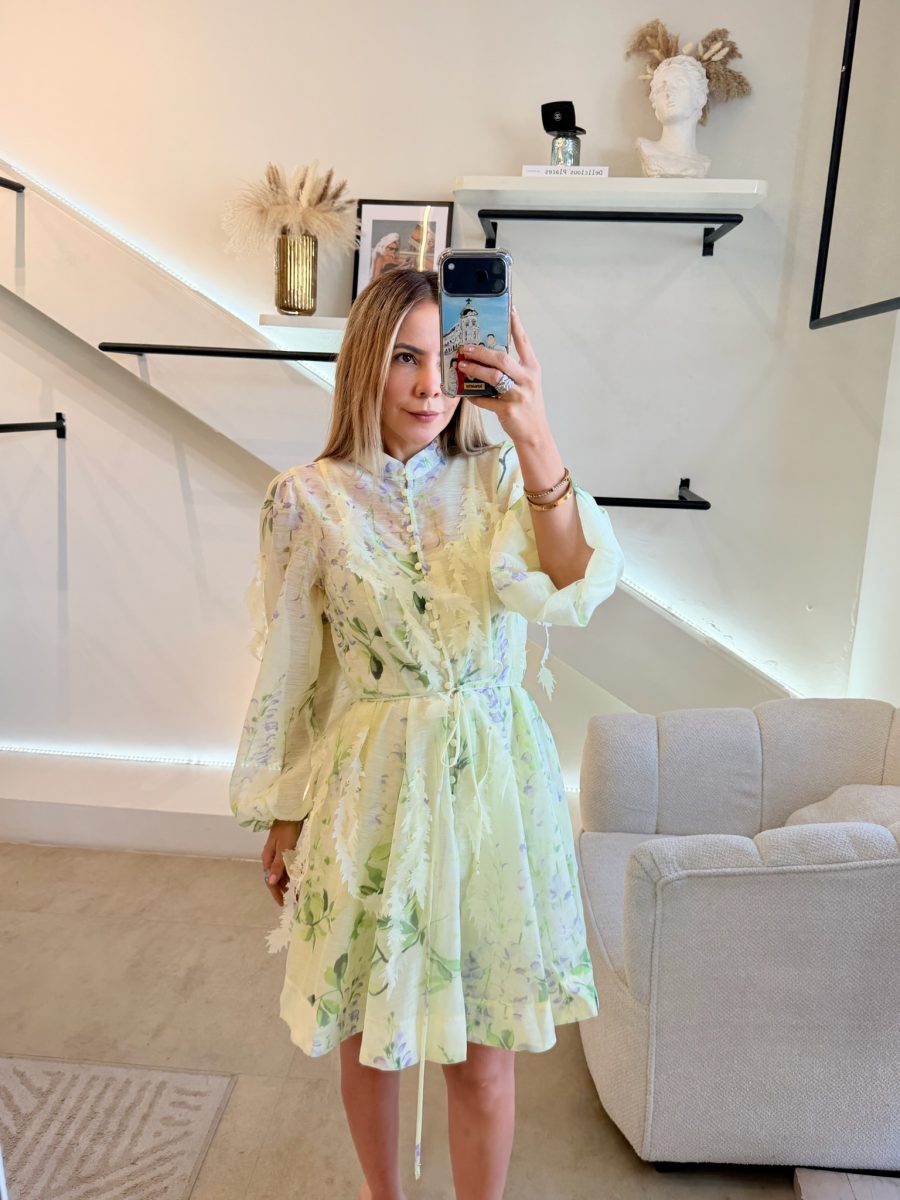 Vestido corto manga larga estampado floral con botones al frente color verde y aplicaciones colgadas