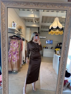 Vestido midi color café tela satinada con manga larga y escote drapeado con pequeña abertura en pierna