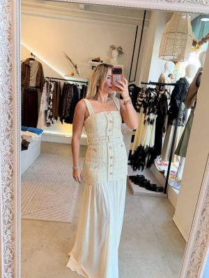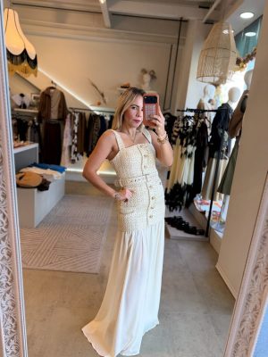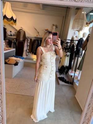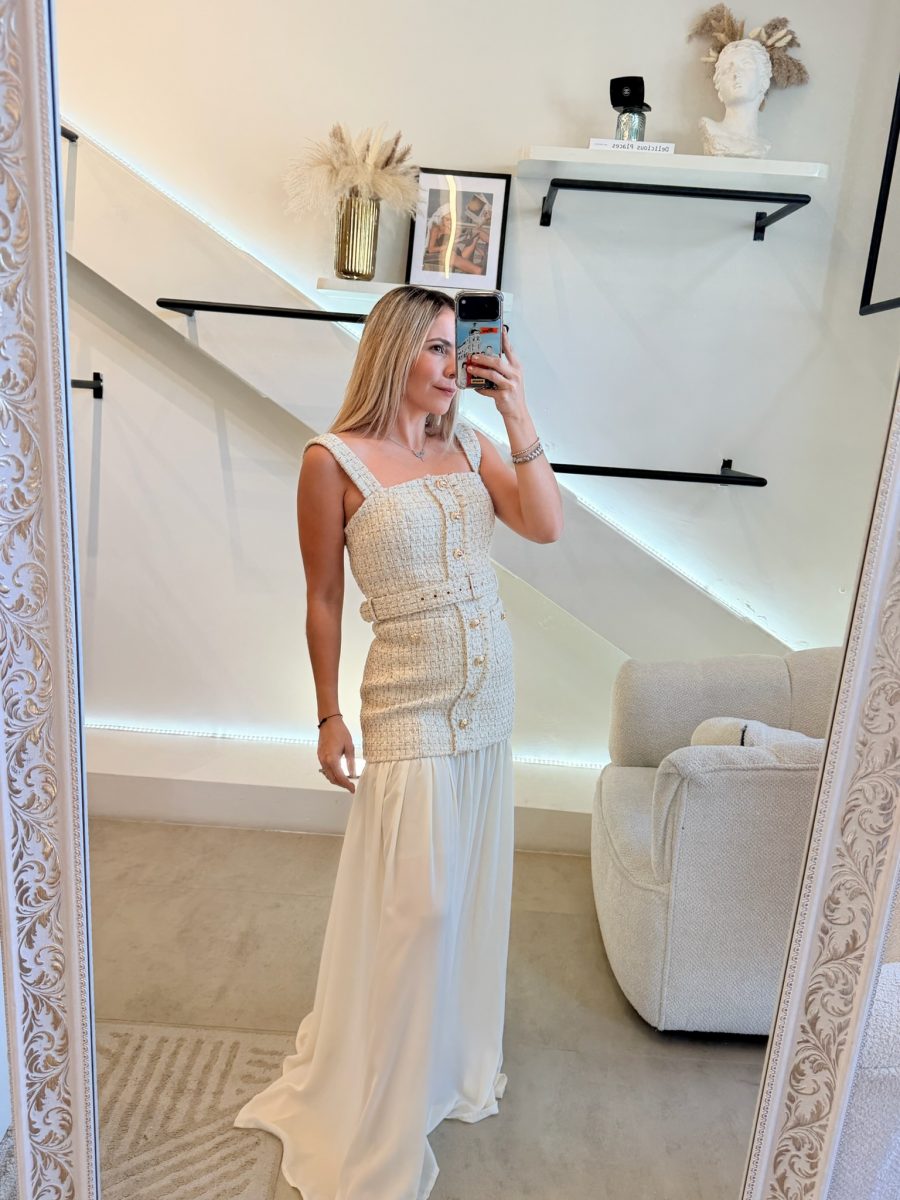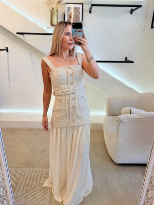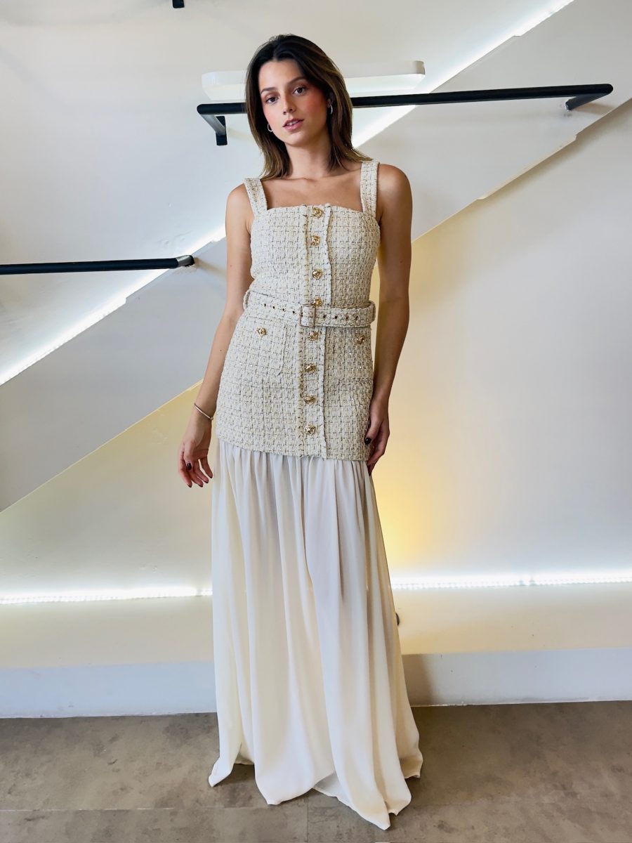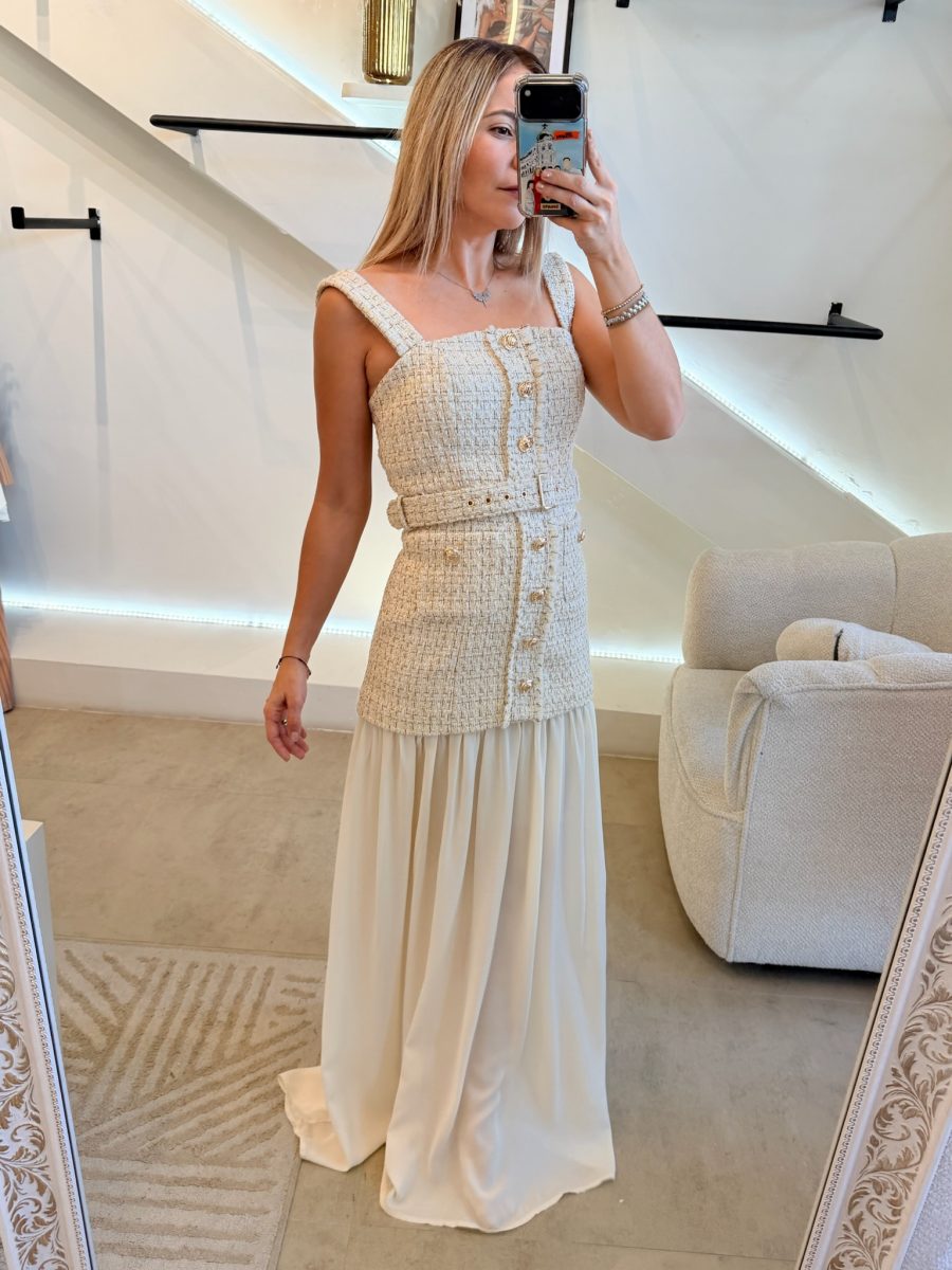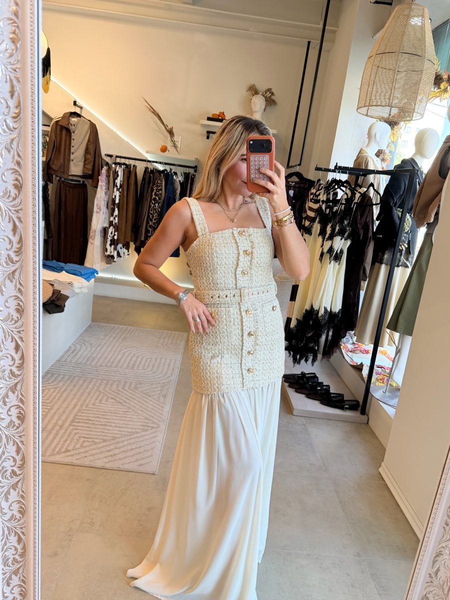 Vestido ivory tipo Chanel con detalles dorados, botones dorados y bolsillos en la partes enfrente.