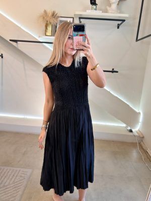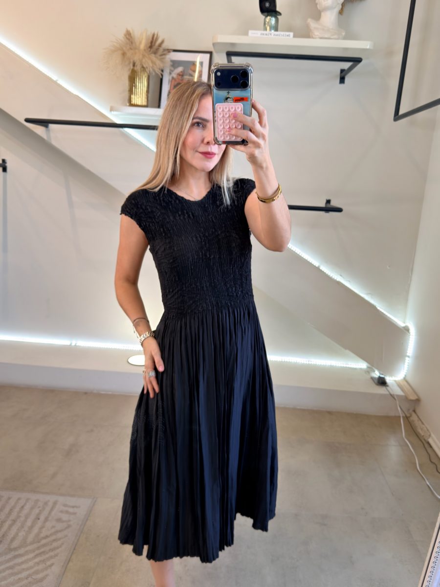 Vestido black con efecto plisado en la parte de arriba y efecto falda liso